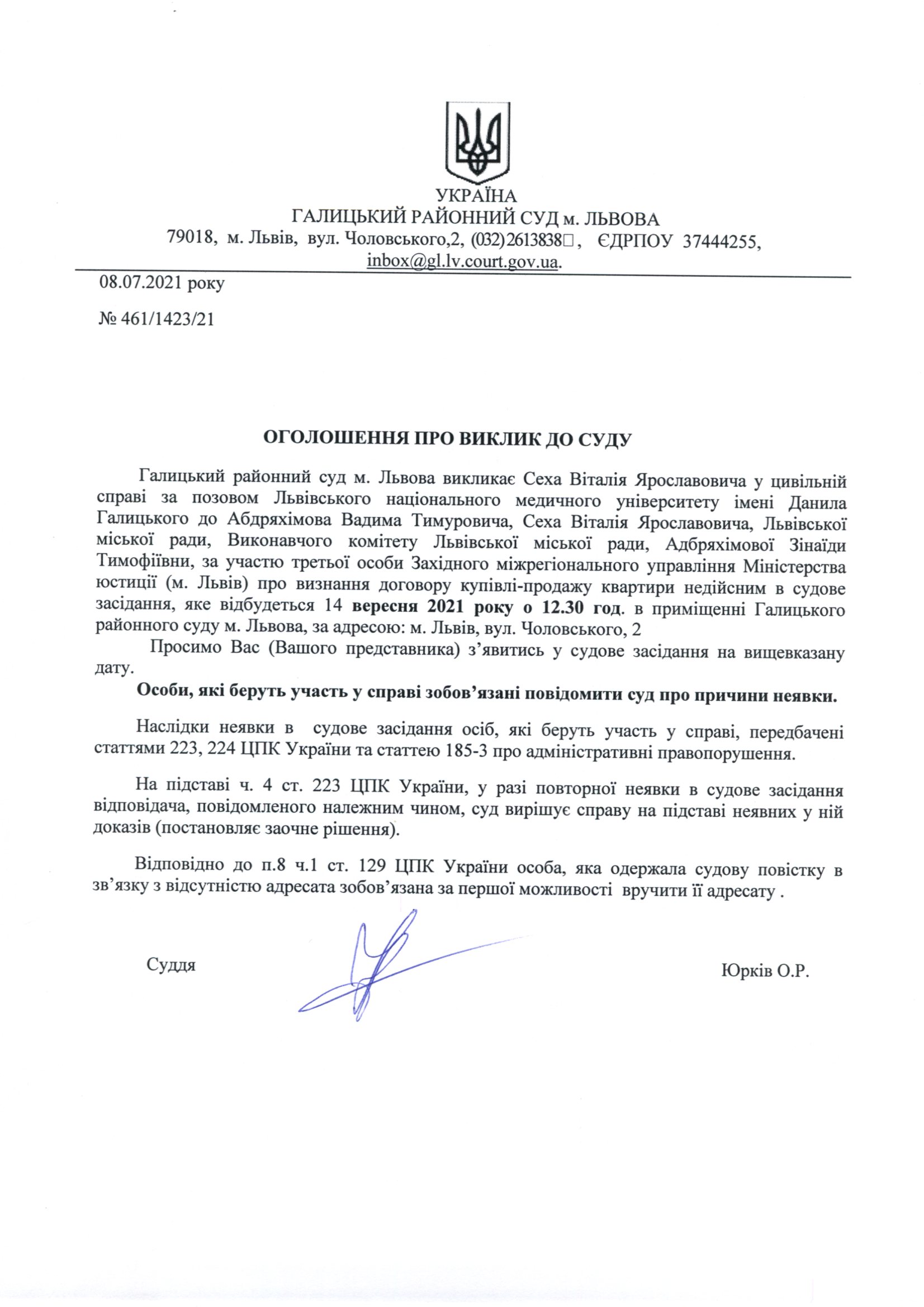 Оголошення про виклик до суду Сеха Віталія Ярославовича