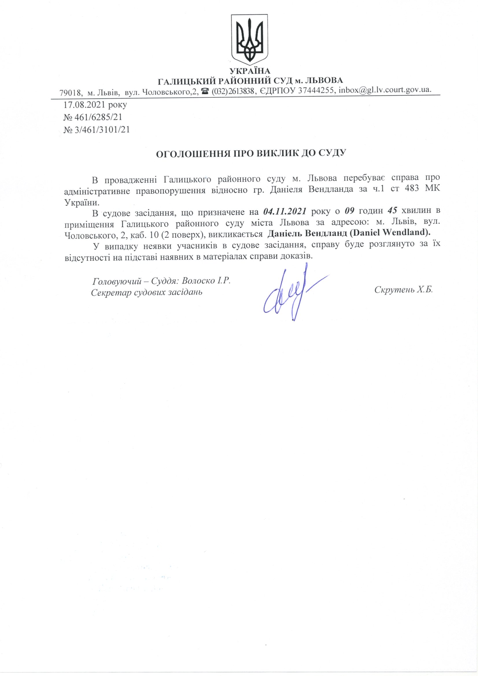 Оголошення про виклик до суду Даніель Вендланд (Daniel Wendland)