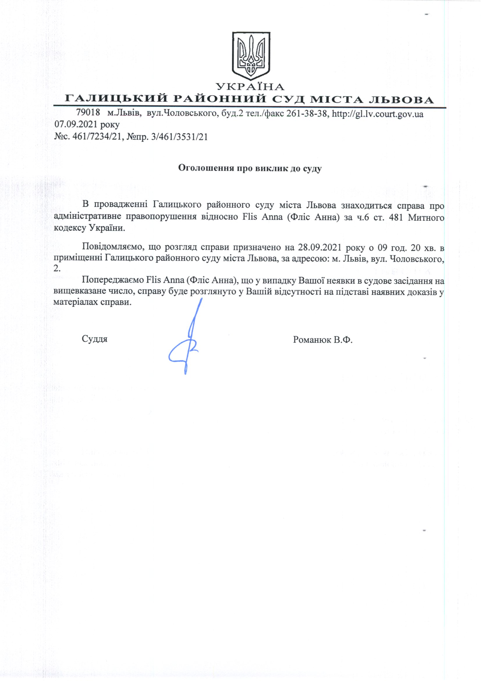 Оголошення про виклик до суду Flis Anna (Фліс Анна)