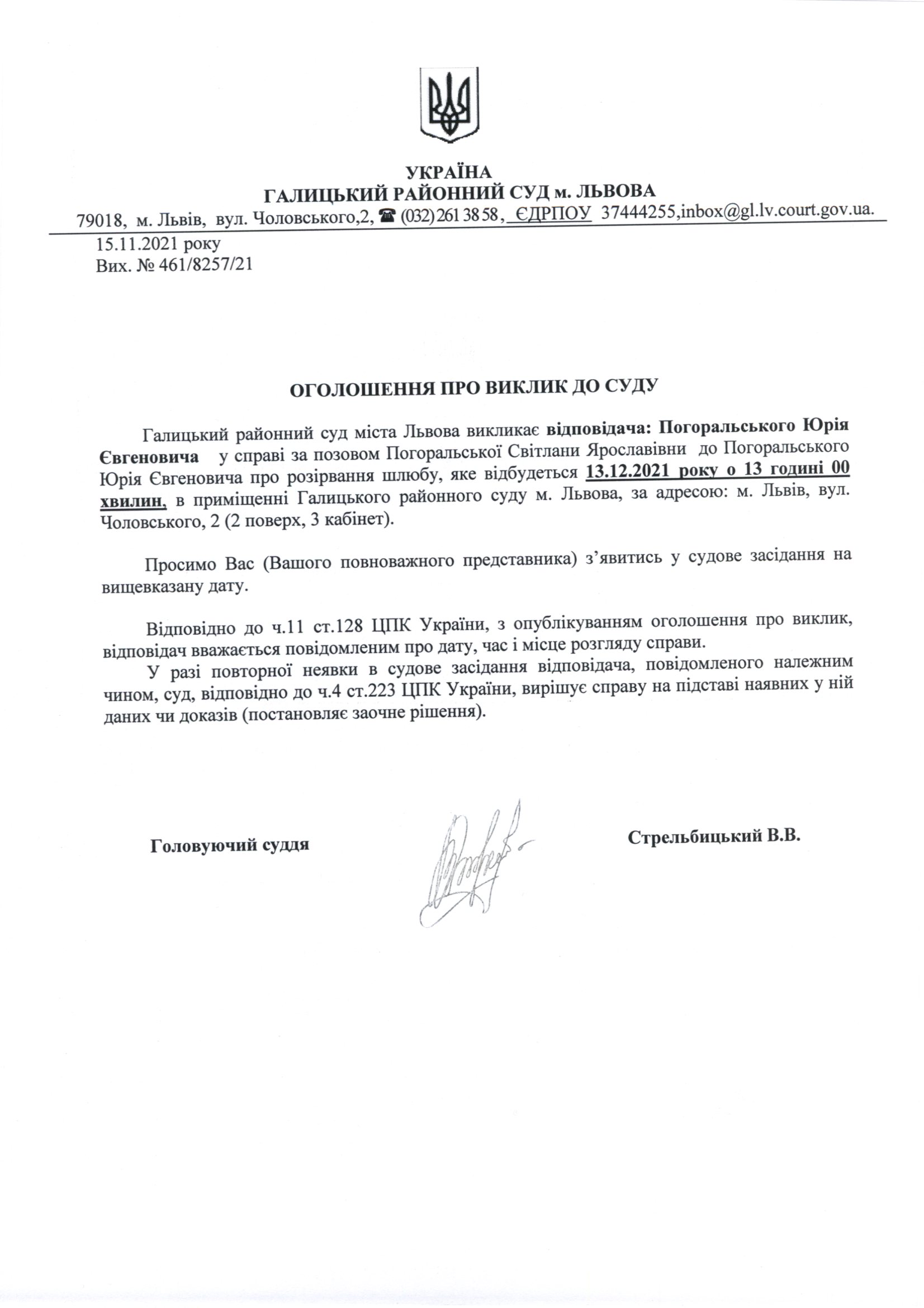 Оголошення про виклик до суду Погоральського Юрія Євгеновича