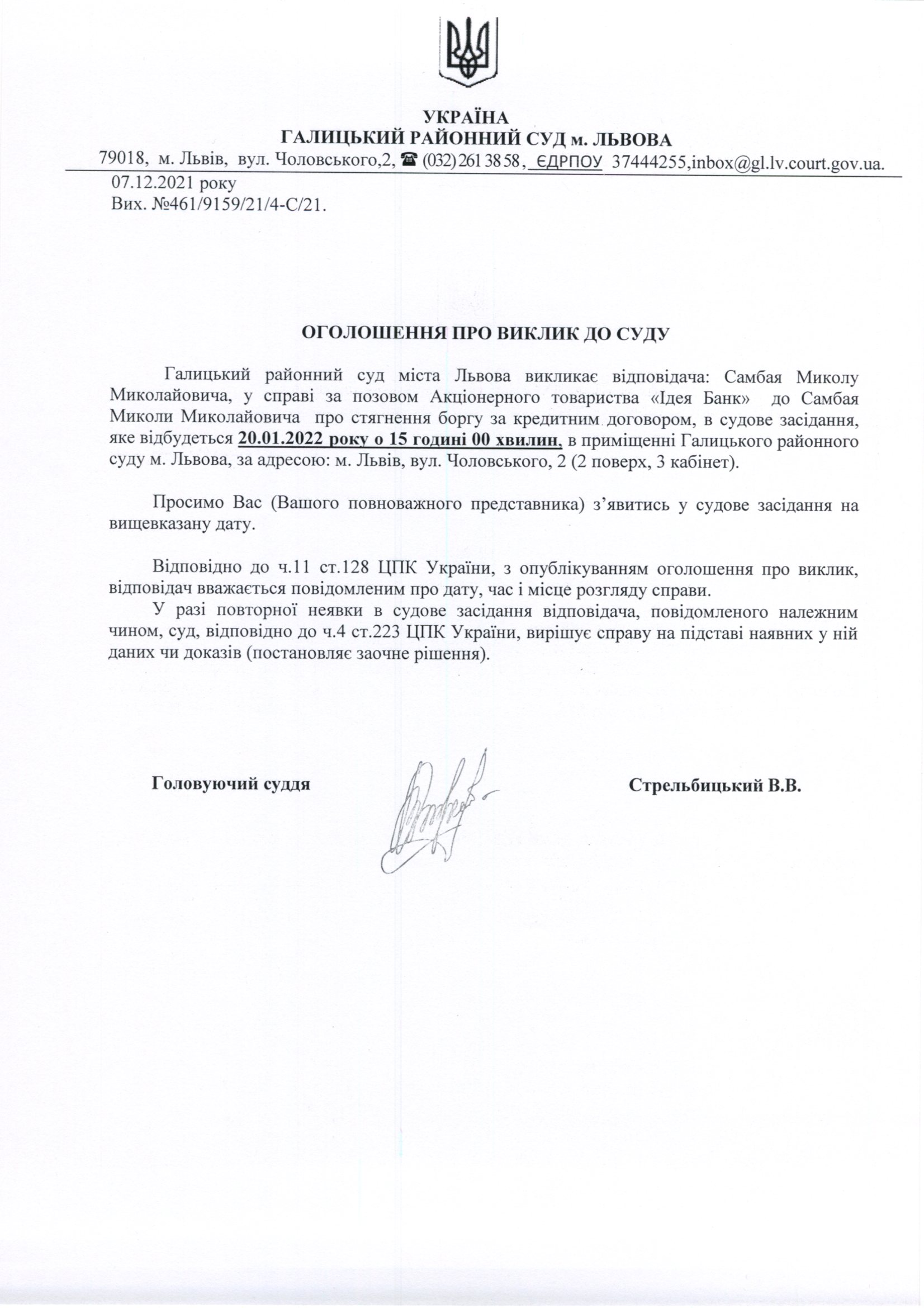 Оголошення про виклик до суду Самбая Миколу Миколайовича
