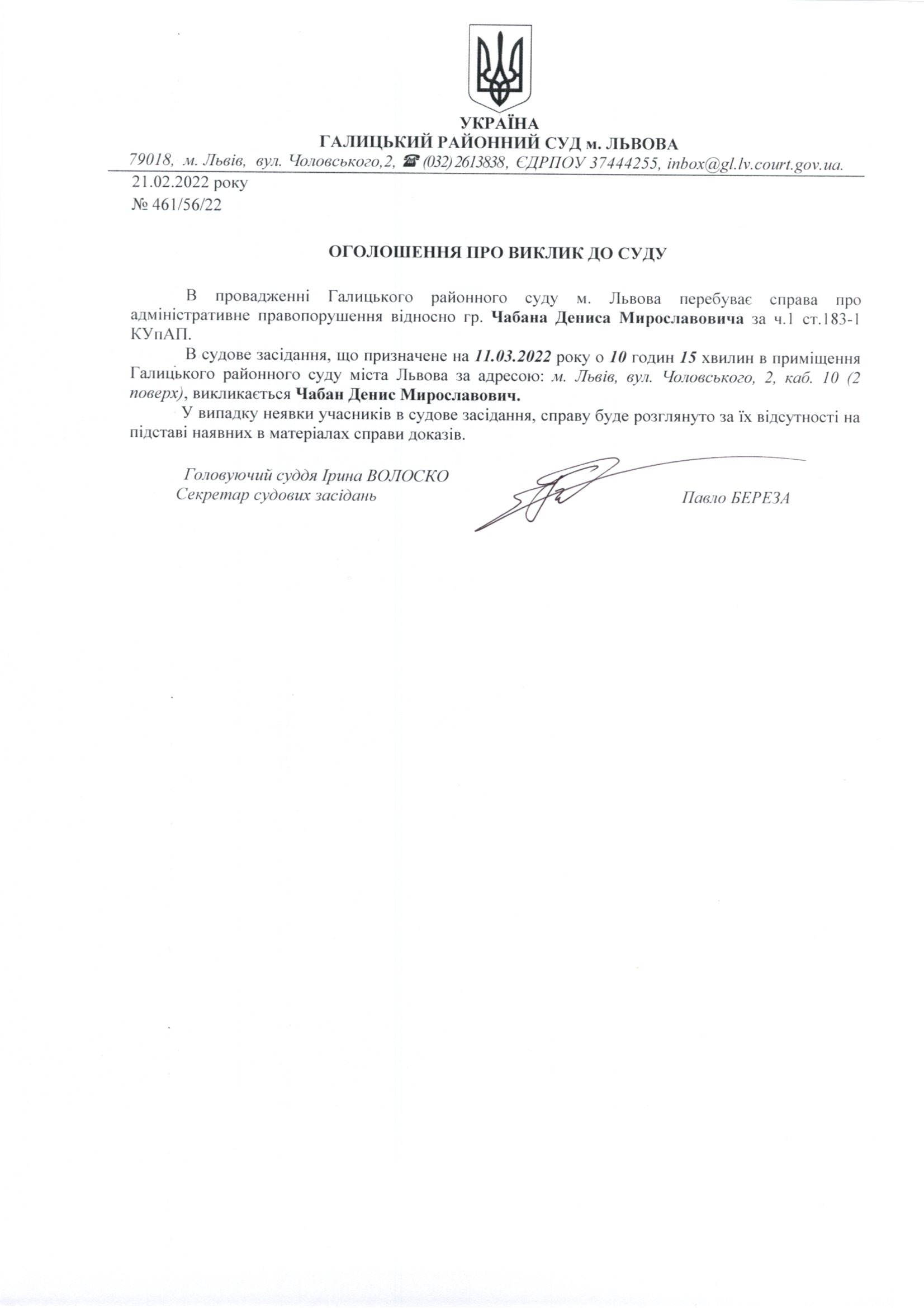 Оголошення про виклик до суду Чабана Дениса Мирославовича