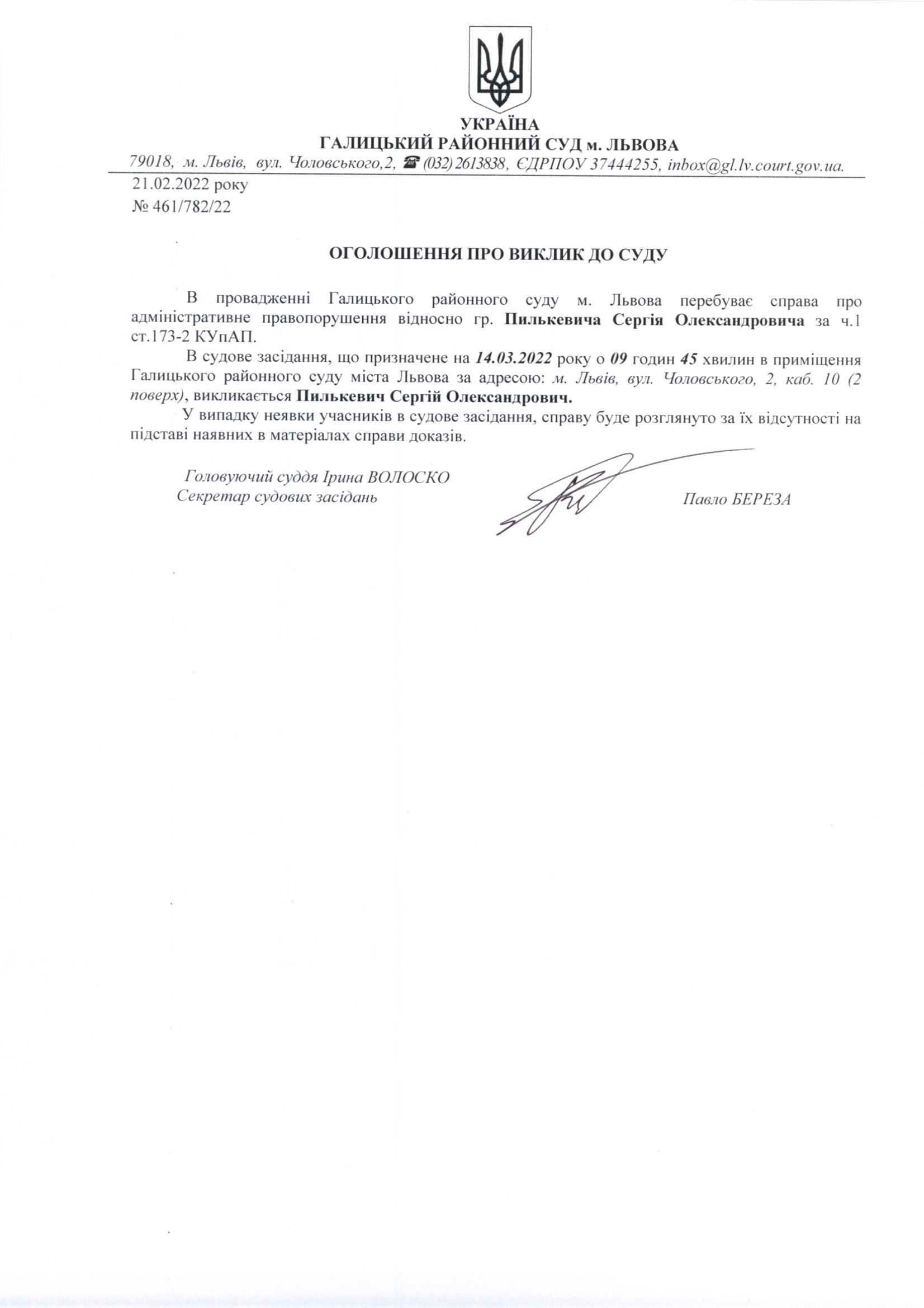 Оголошення про виклик до суду Пилькевича Сергія Олександровича