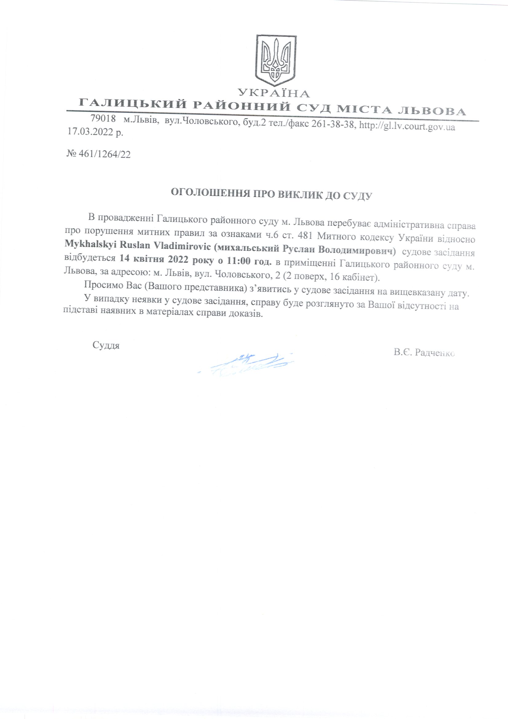 Оголошення про виклик до суду Михальського Руслана Володимировича
