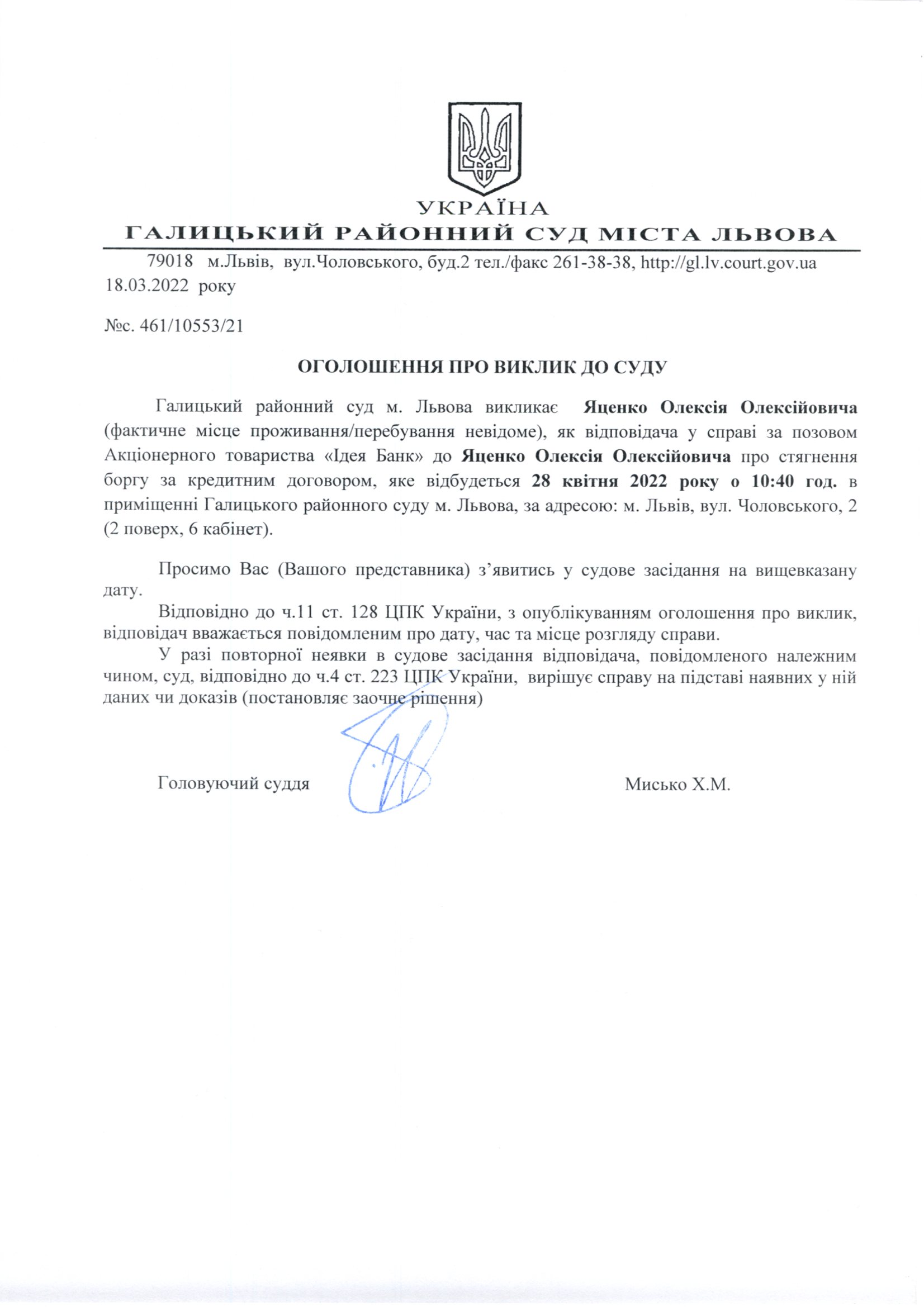 Оголошення про виклик до суду Яценко Олексія Олексійовича