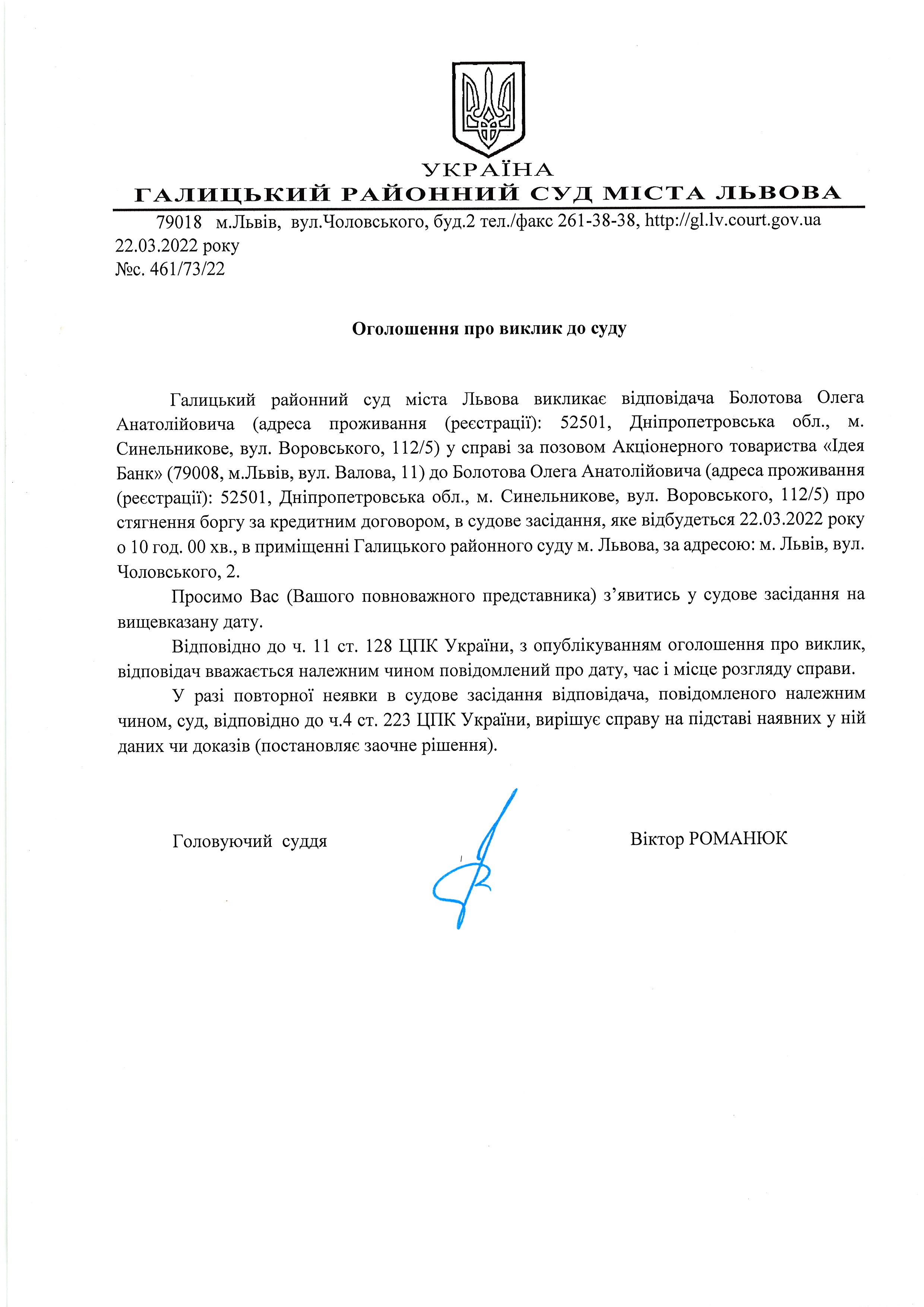 Оголошення про виклик до суду Болотова О.А.