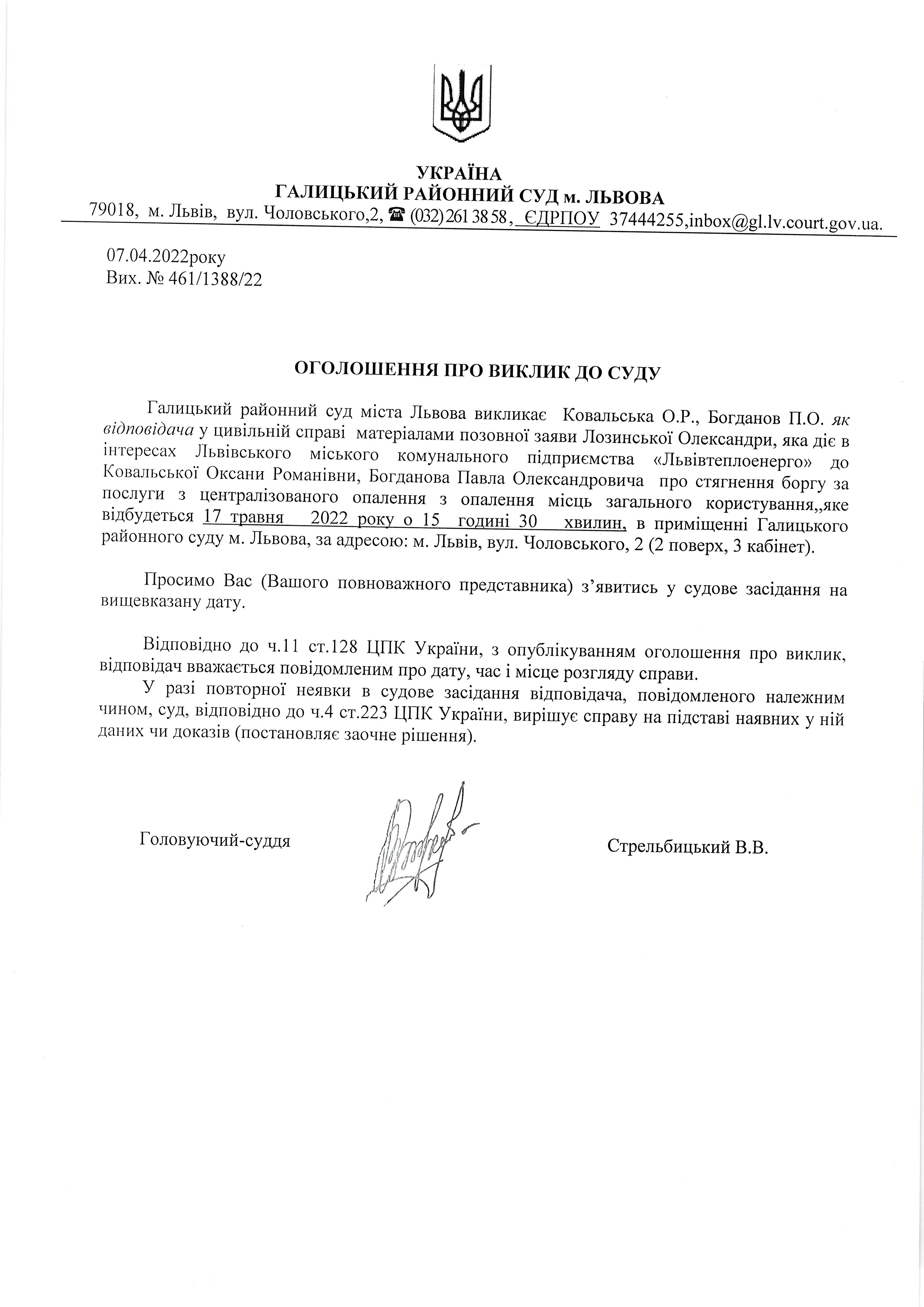 Оголошення про виклик до суду Ковальської О.Р. та Богданова П.О.
