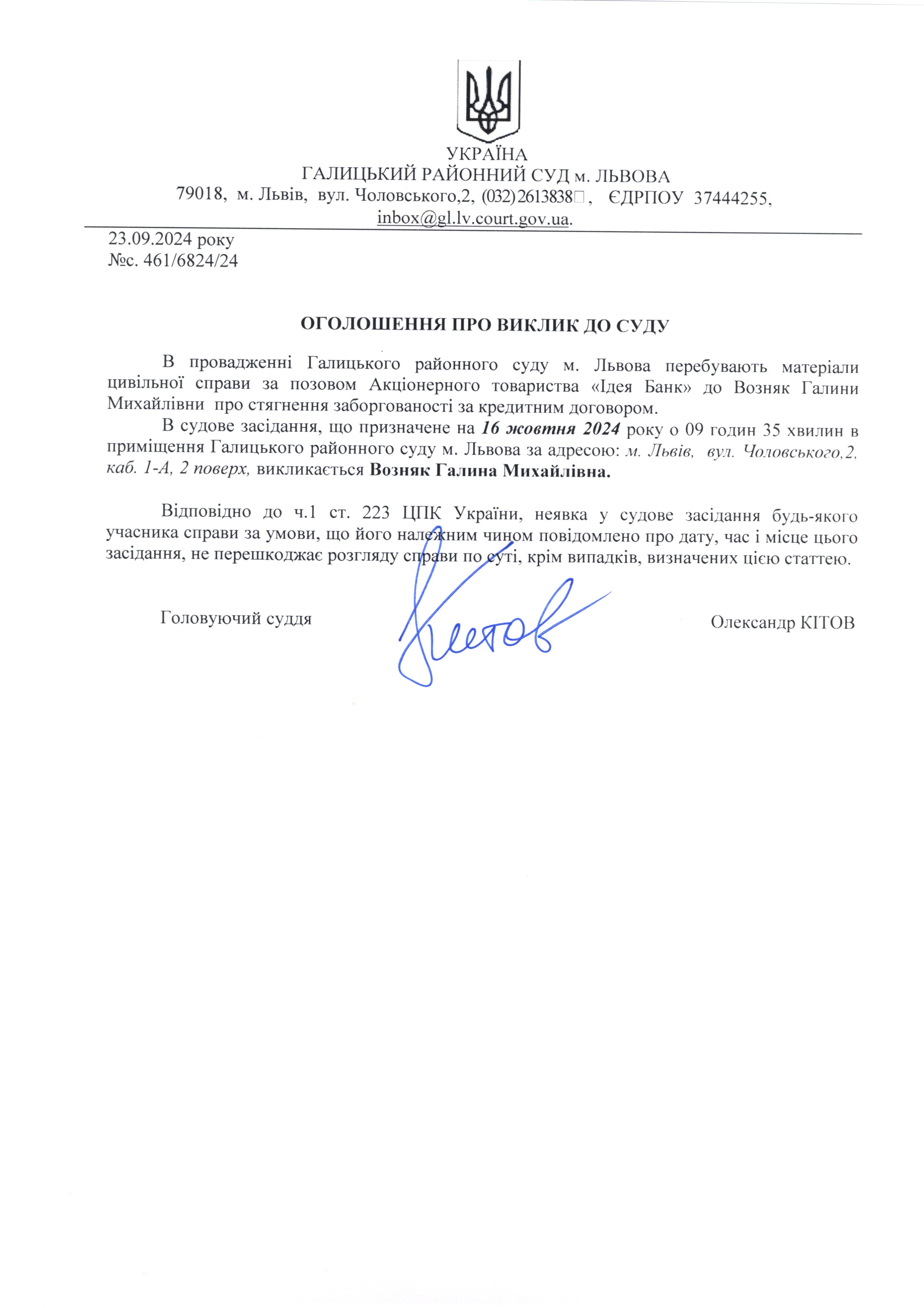 оголошення про виклик Возняк Г.М.