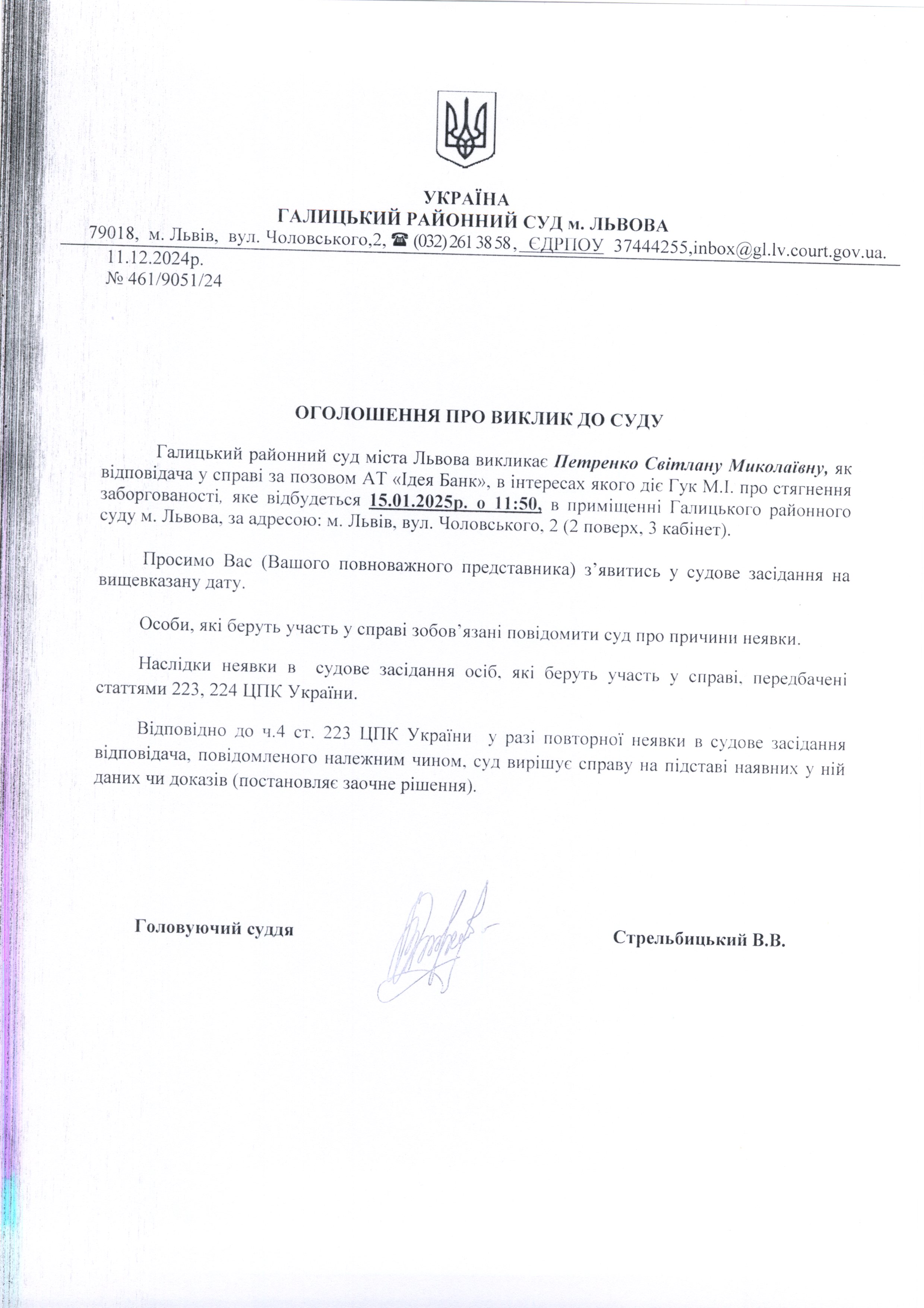 оголошення про виклик Петренко С.М.