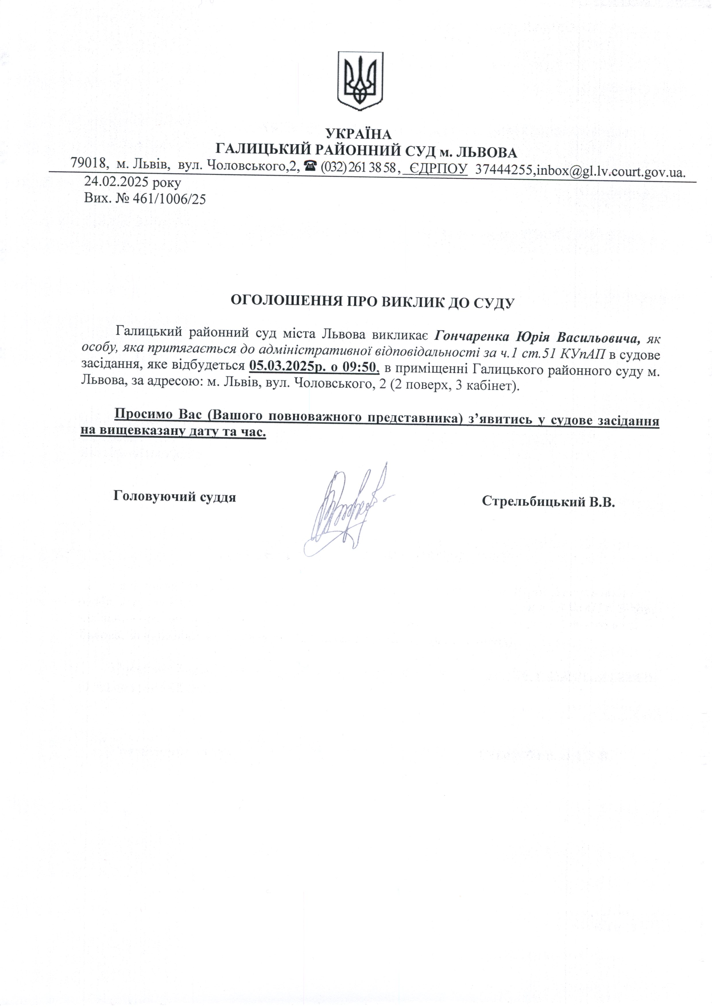 оголошення про виклик Гончаренка Ю.В.