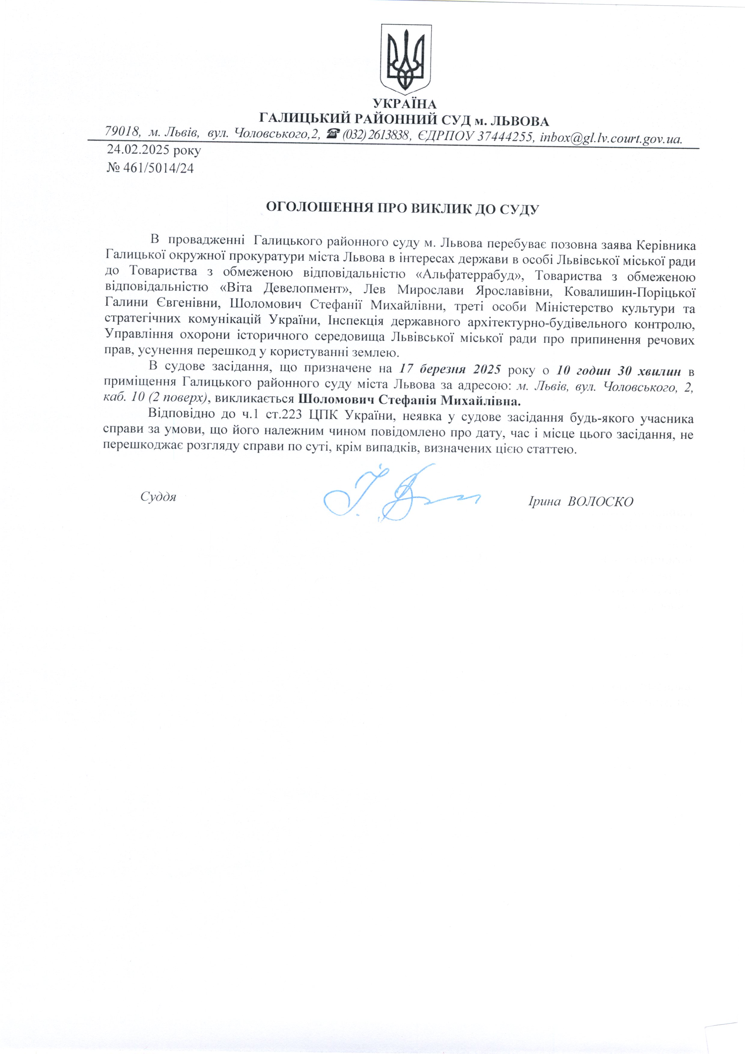 оголошення про виклик Шоломович С.М.
