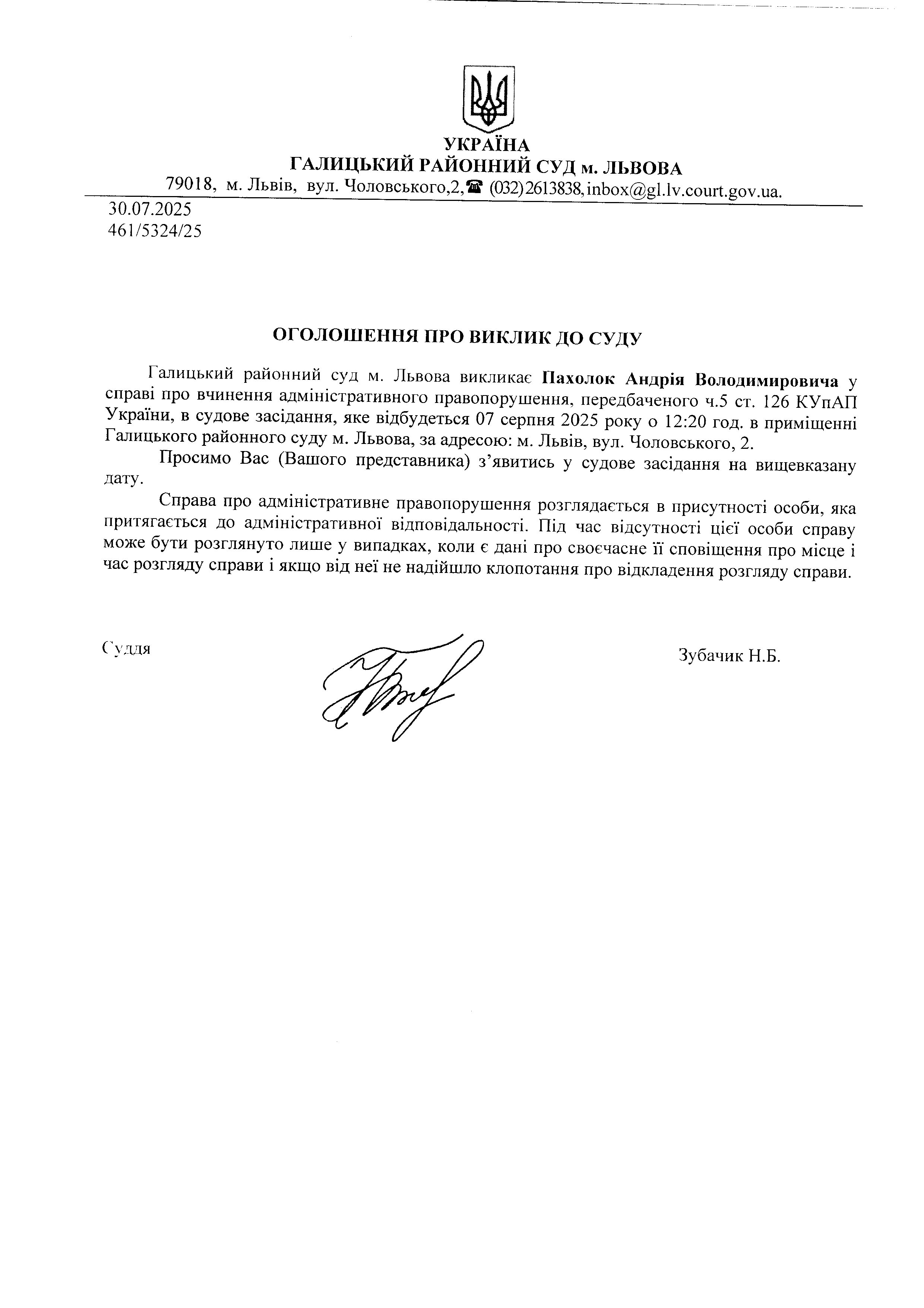 оголошення про виклик Пахолок А.В.