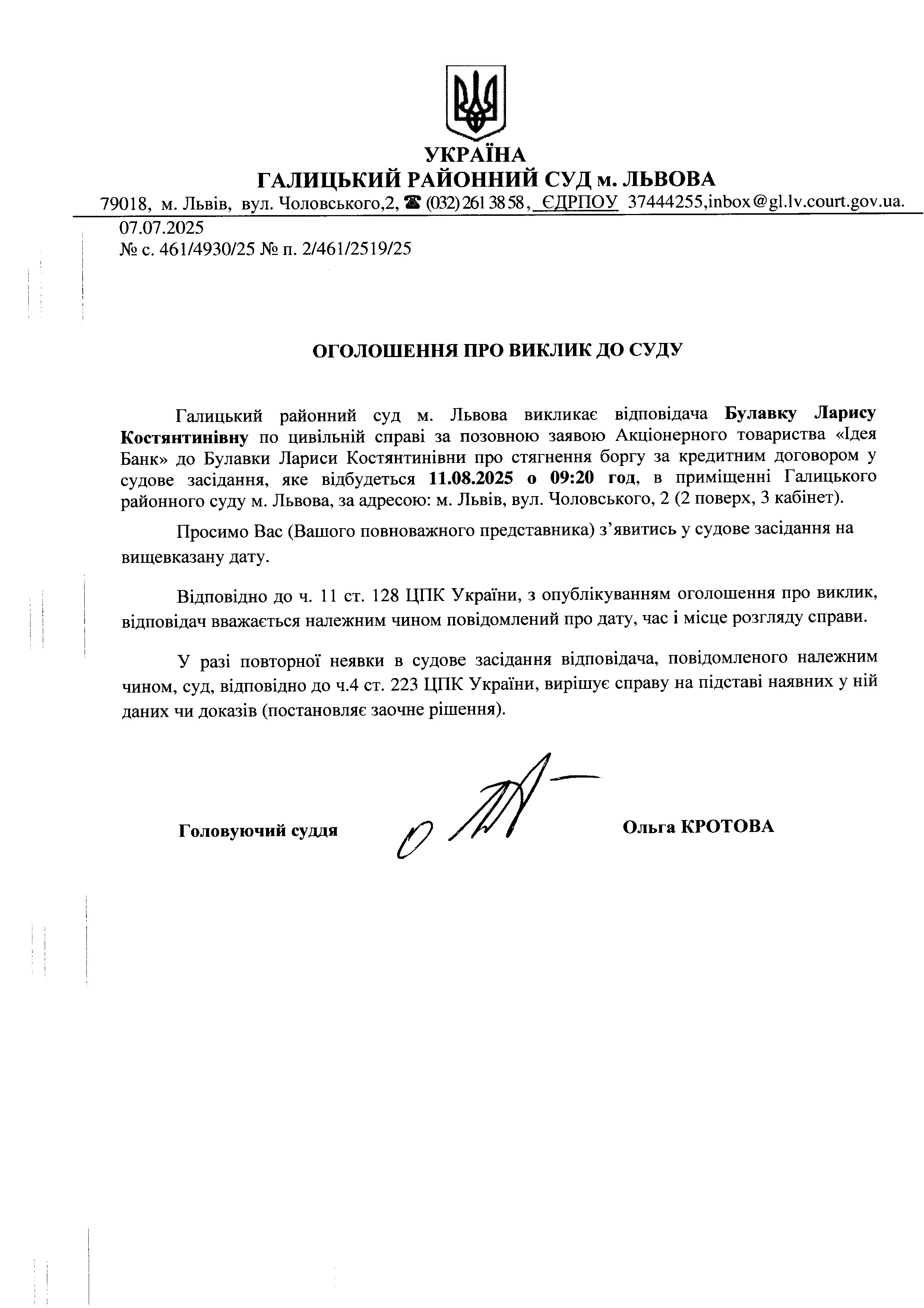 Оголошення про виклик Булавку Л.К.