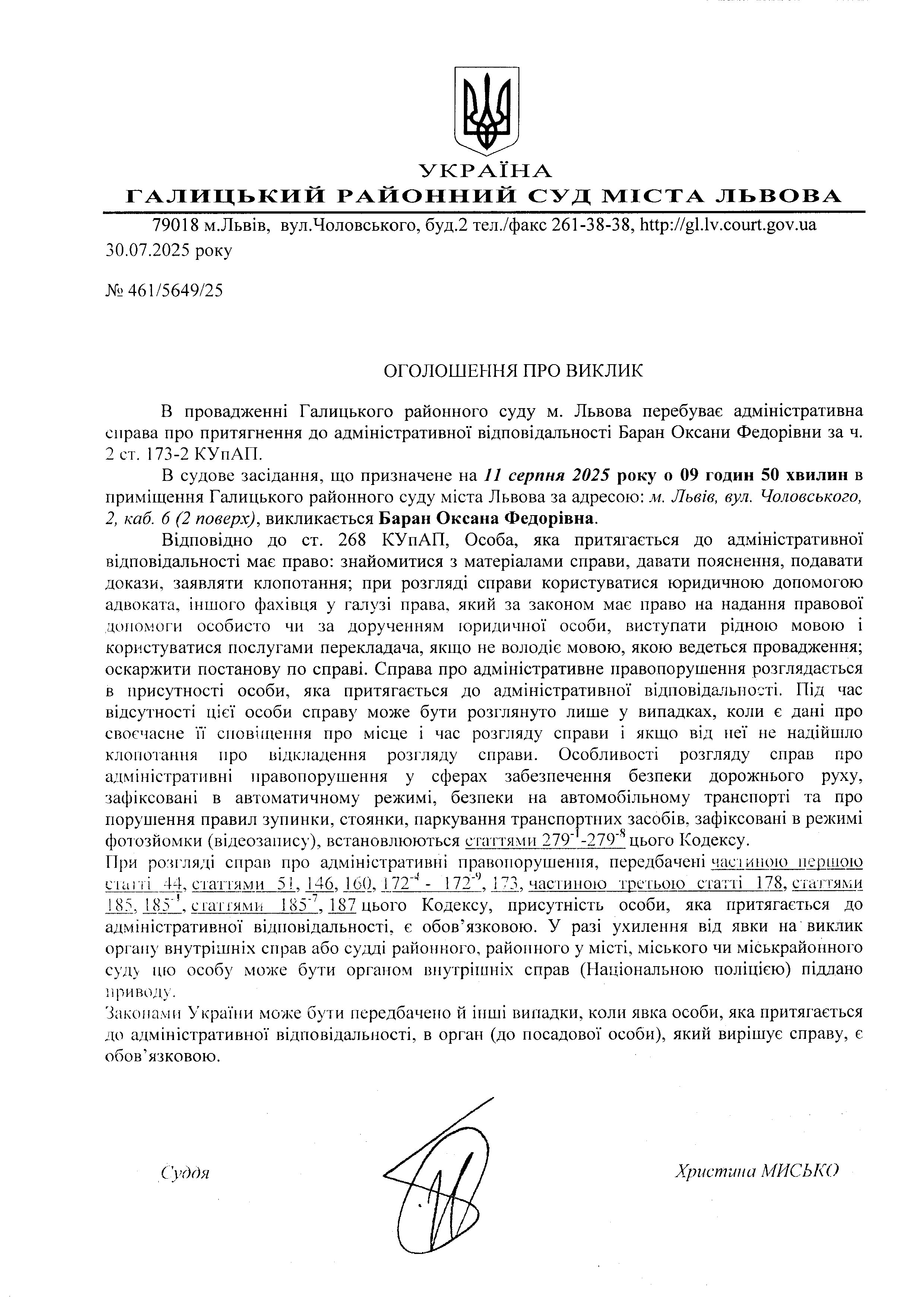 Оголошення про виклик Баран О.Ф.