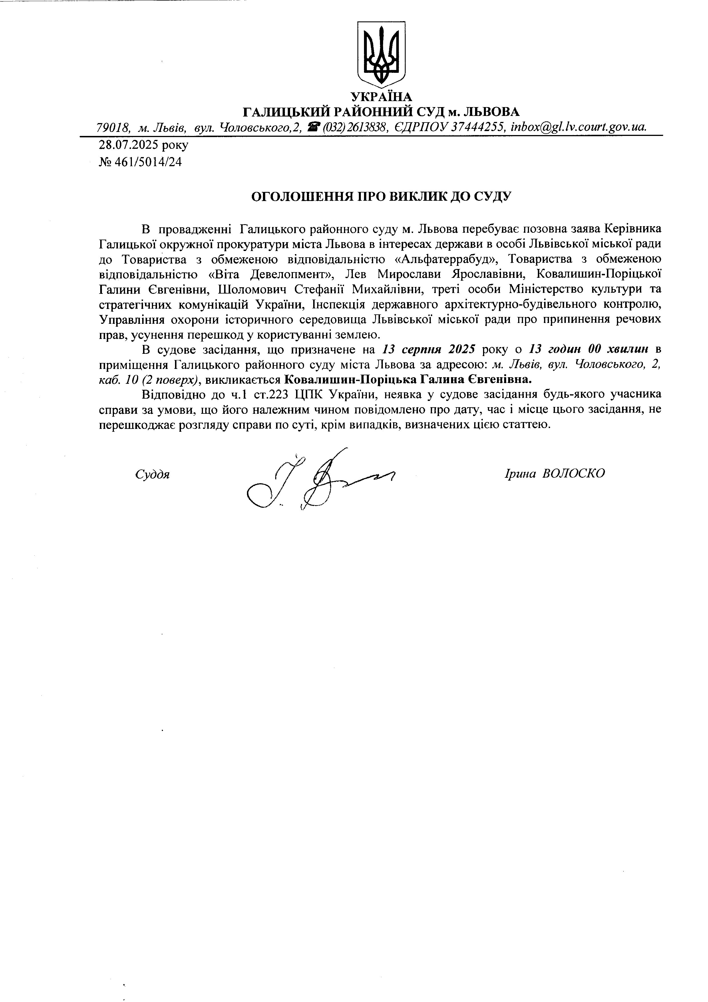 оголошення про виклик Ковалишин Г.Є.