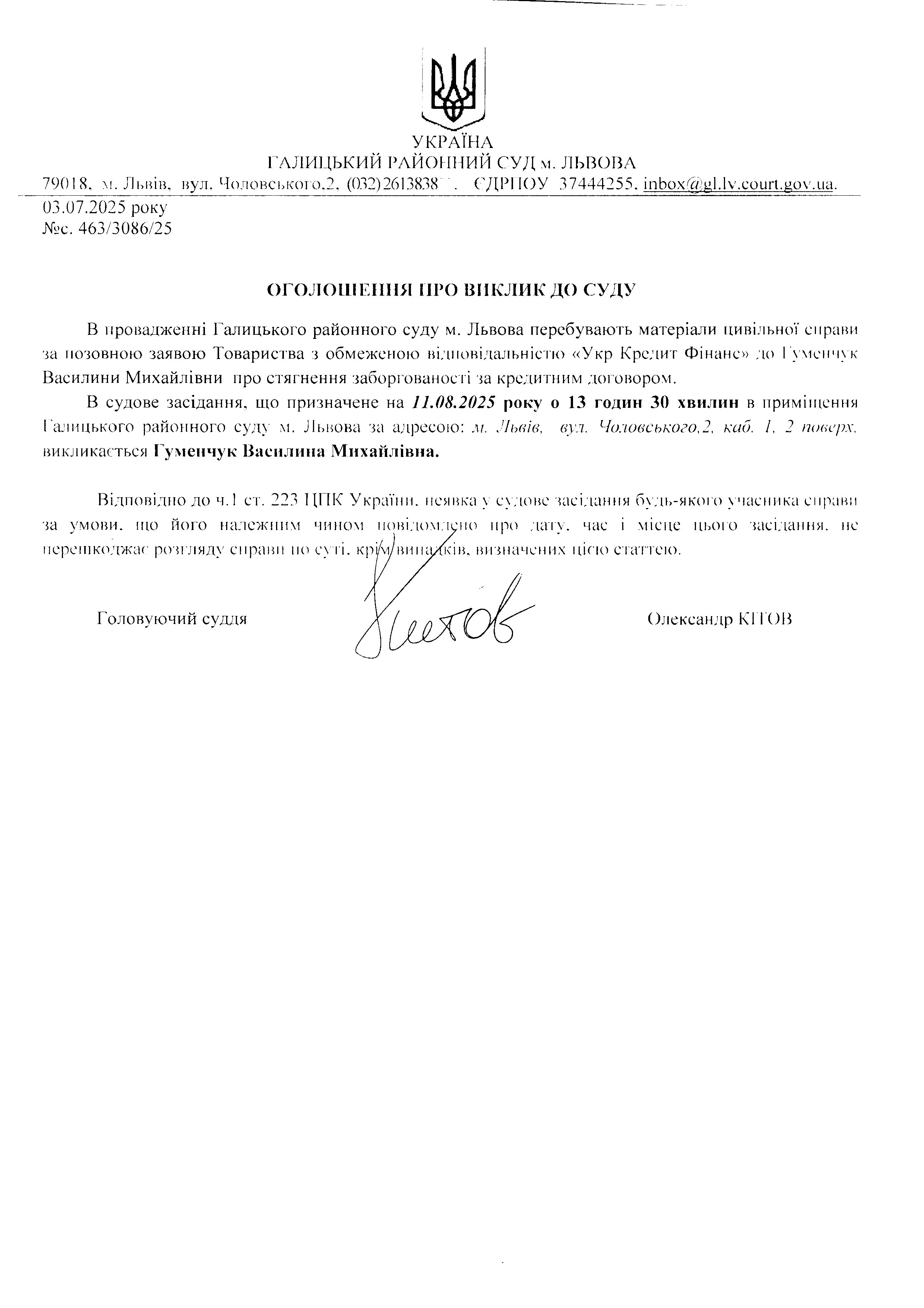 оголошення про виклик Гуменчук В.М.