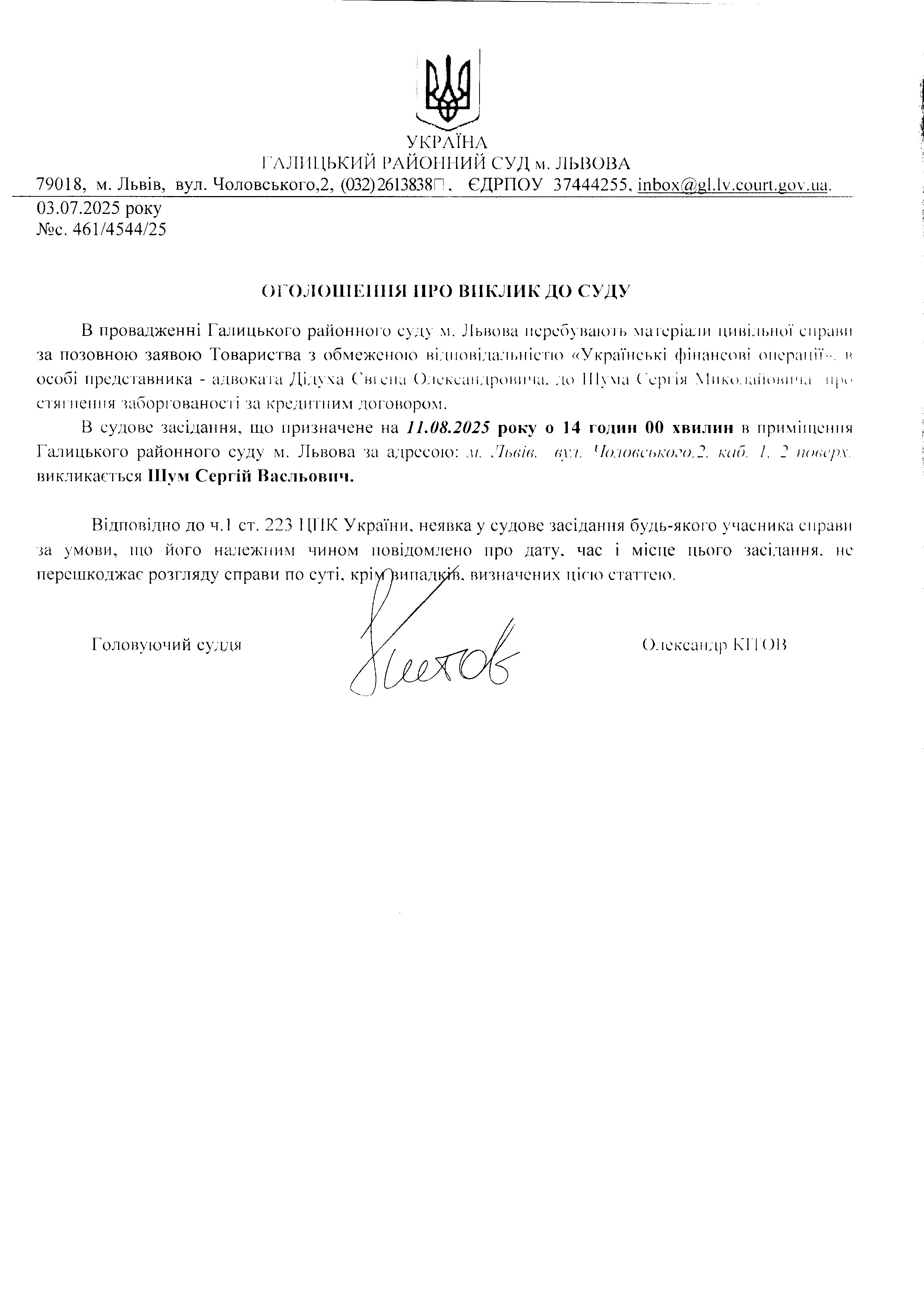 оголошення про виклик Шум С.В.