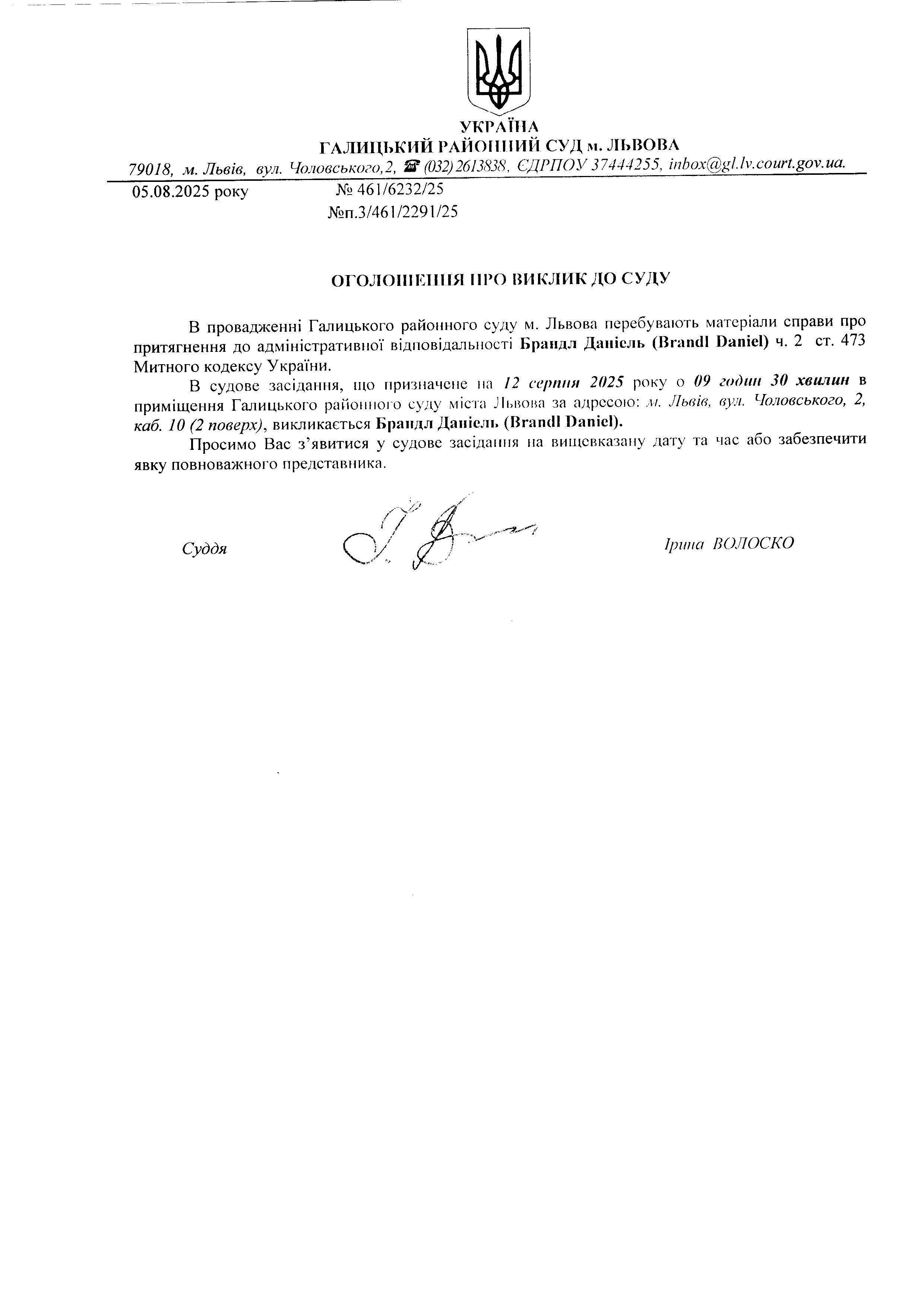 оголошення про виклик Брандл Даніеля (Brandl daniel)