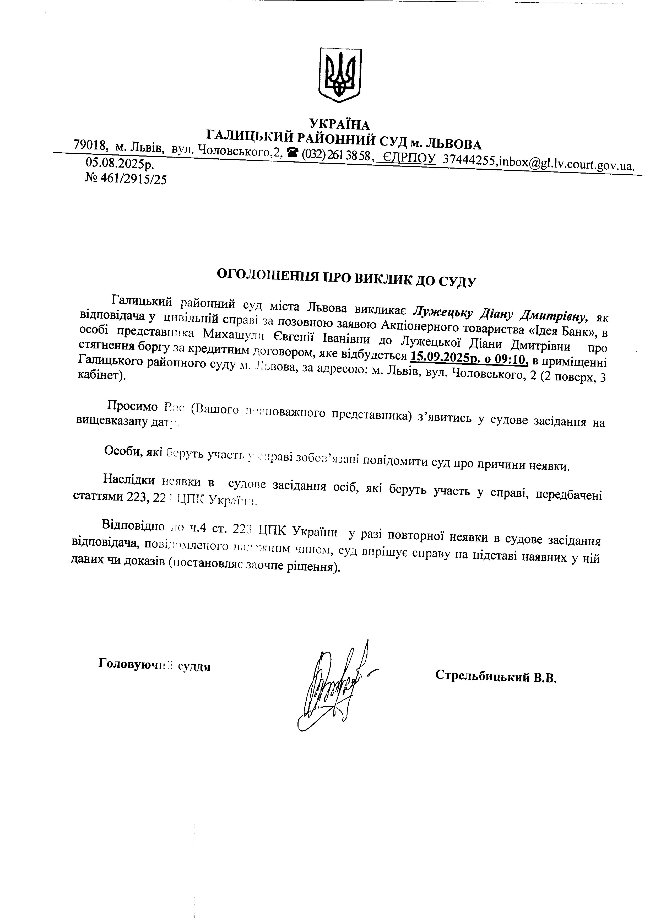 оголошення про виклик Лужецьку Д.Д.