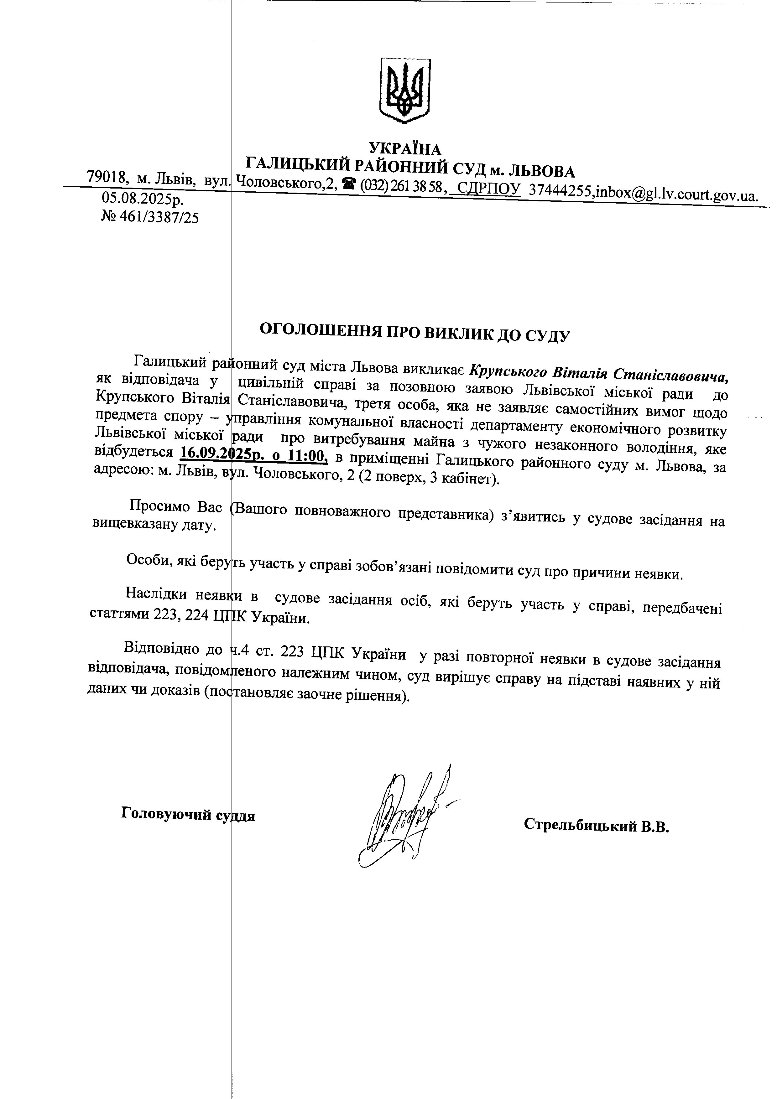 оголошення про виклик Крупського В.С.