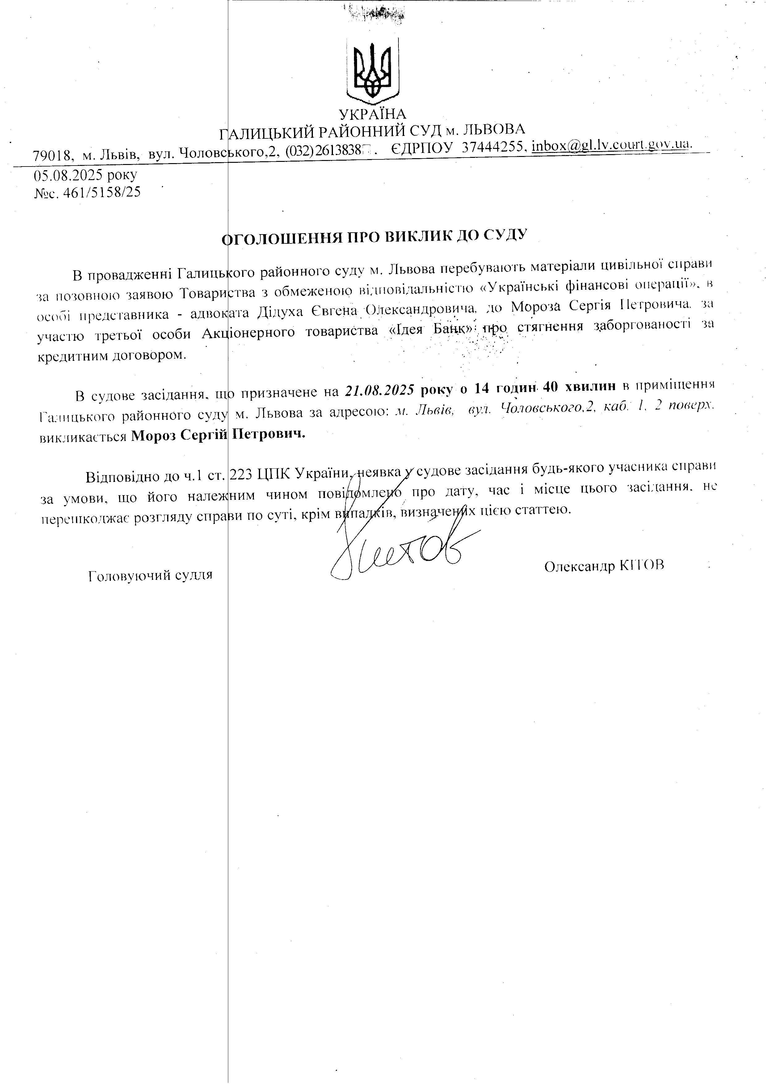 оголошення про виклик Мороз С.П.