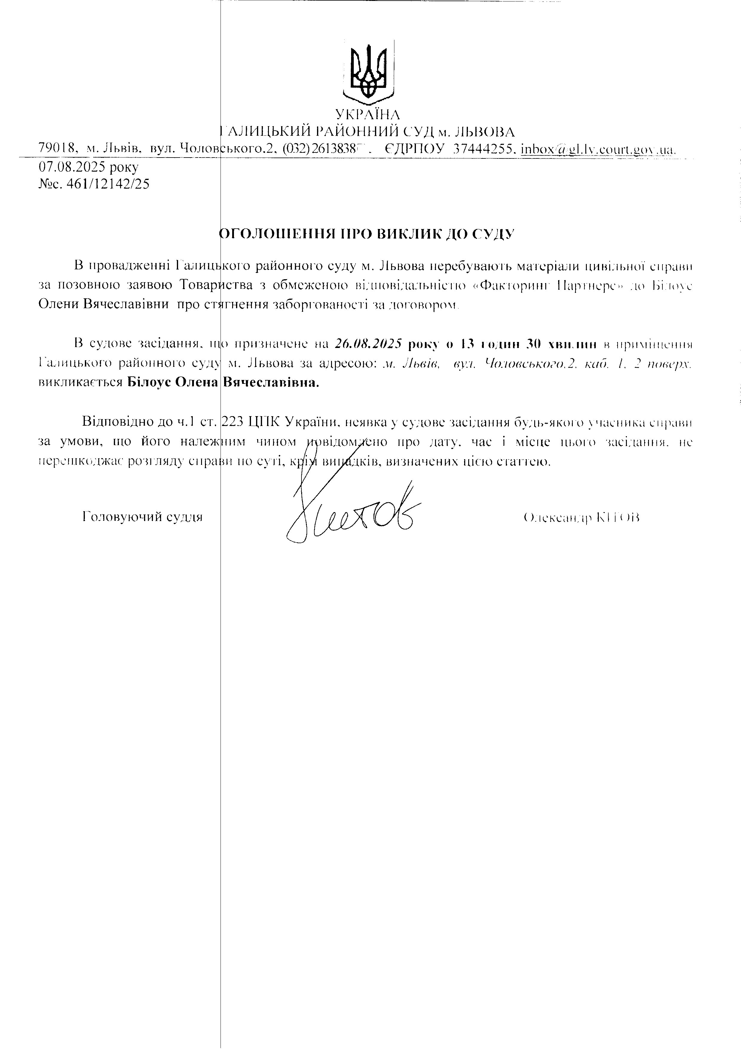 оголошення про виклик Білоус О.В.