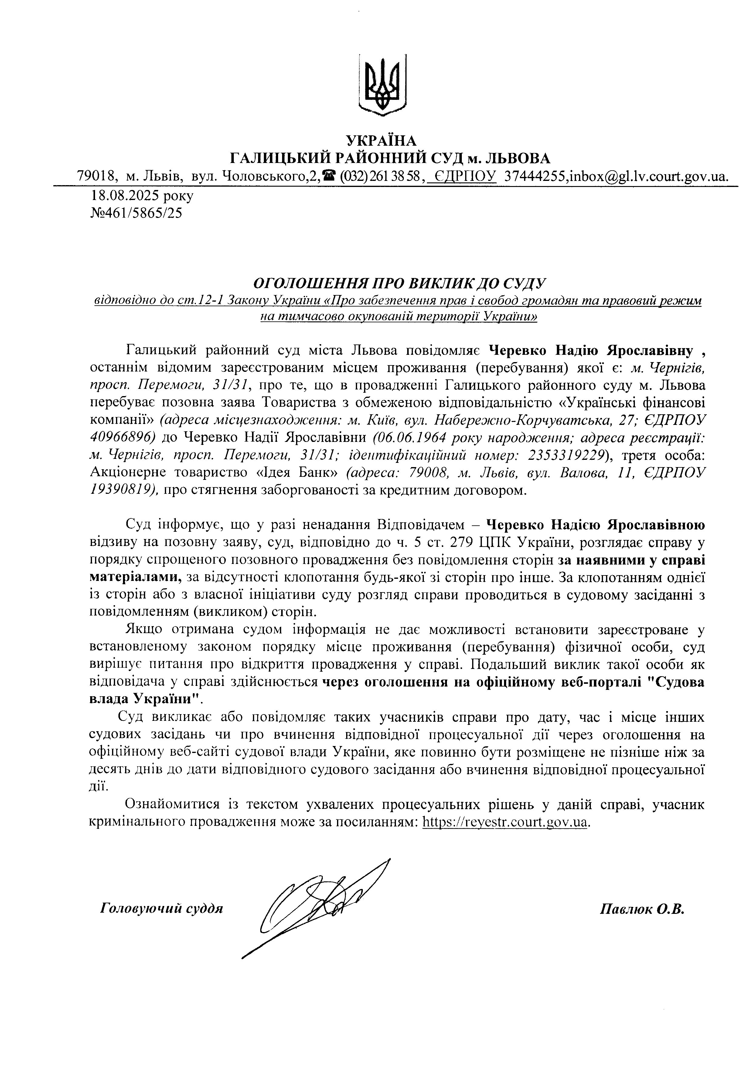 оголошення про виклик Черевко Н.Я.