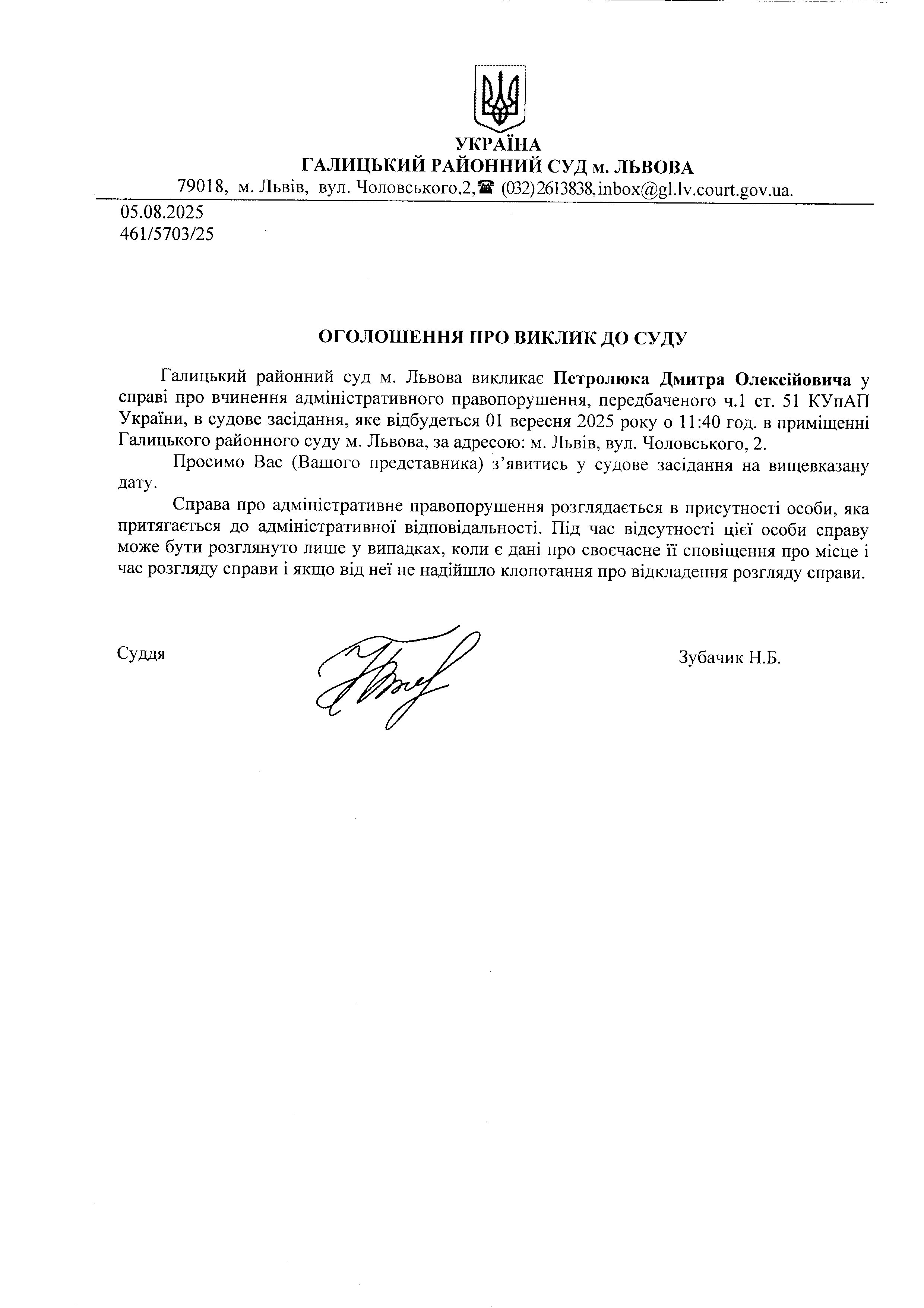 оголошення про виклик Петролюка Д.О.