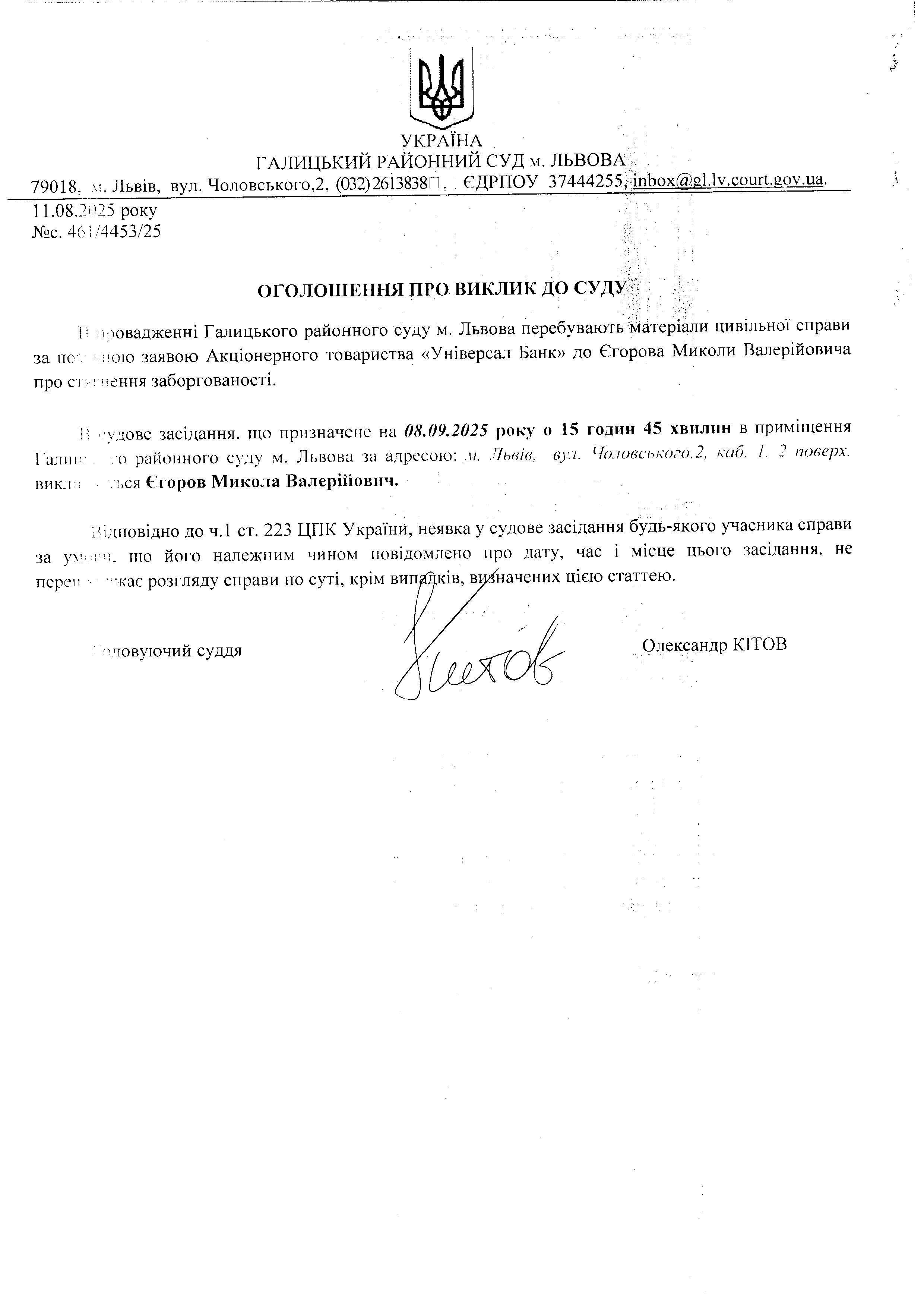 оголошення про виклик Єгорова М.В.