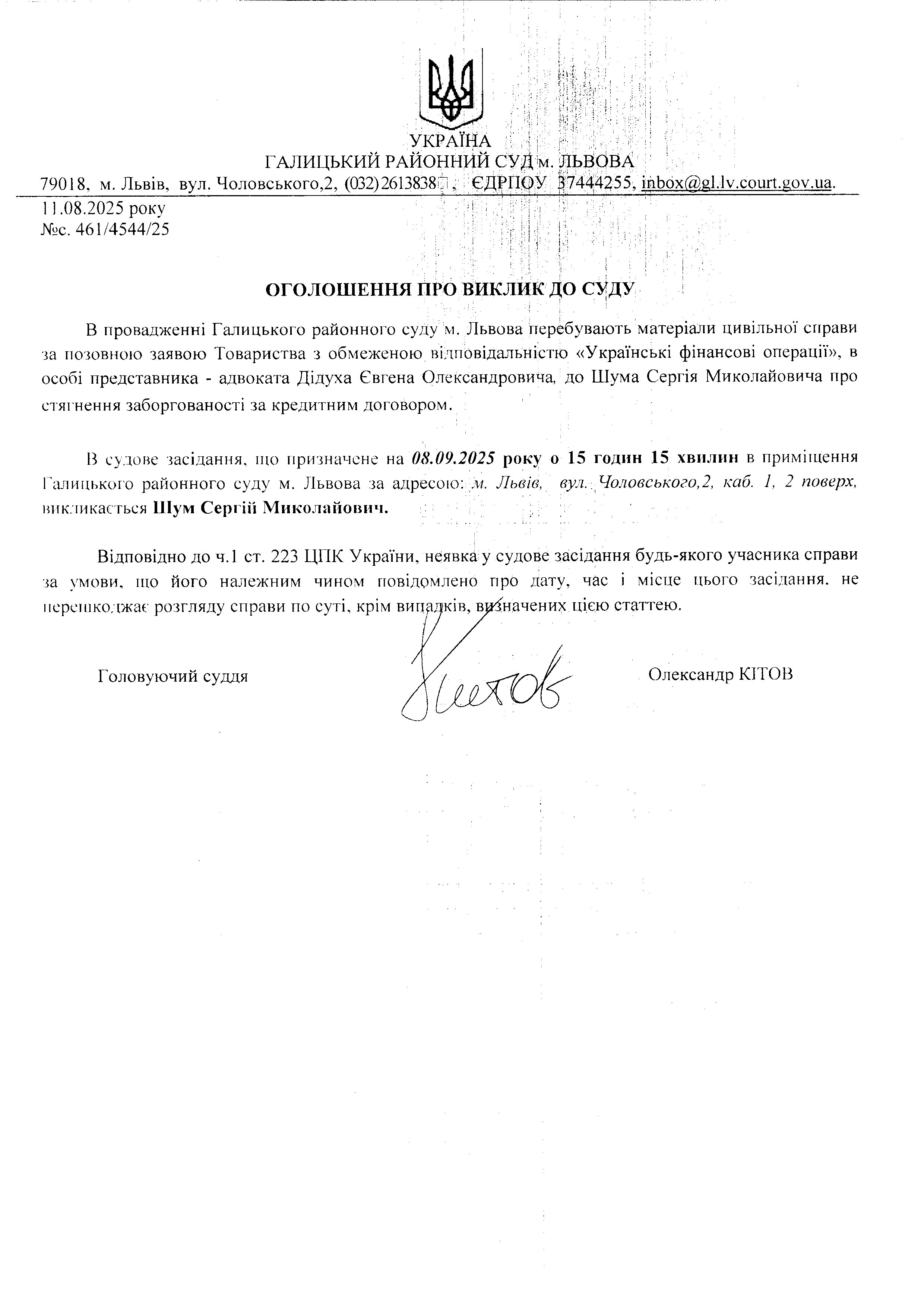 оголошення про виклик Шум С.В.