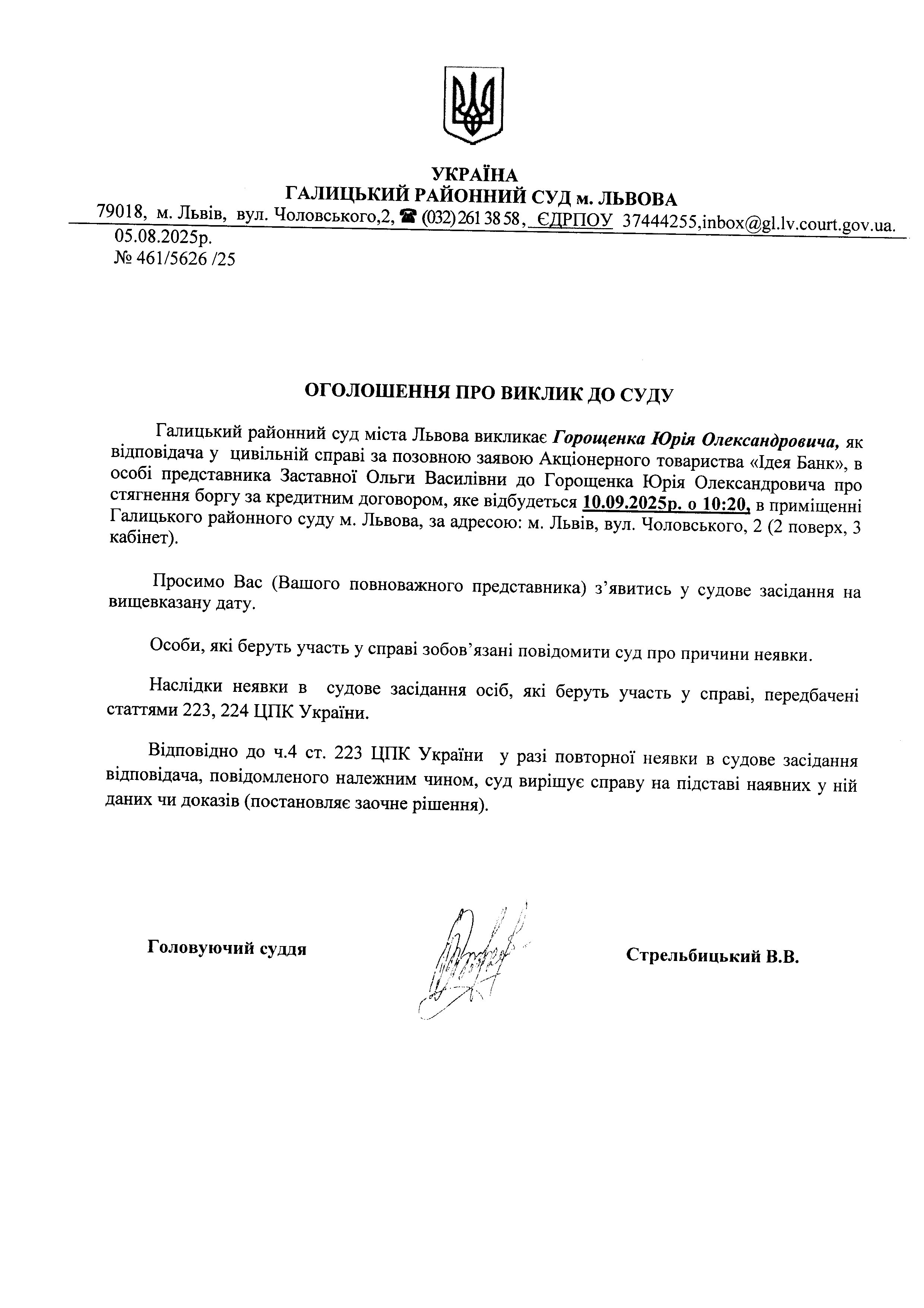оголошення про виклик Горощенка Ю.О.