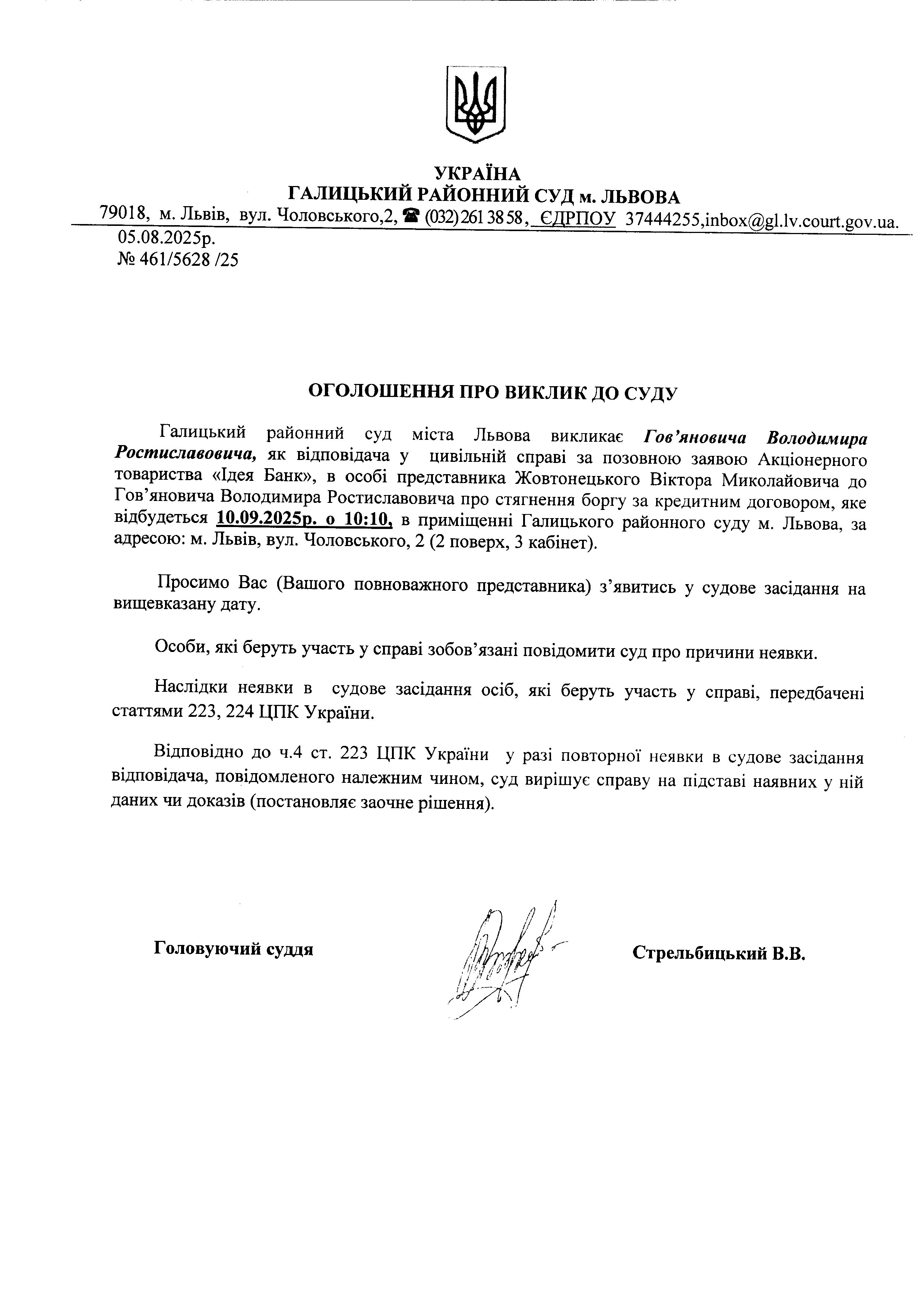 оголошення про виклик Гов'яновича В.Р.