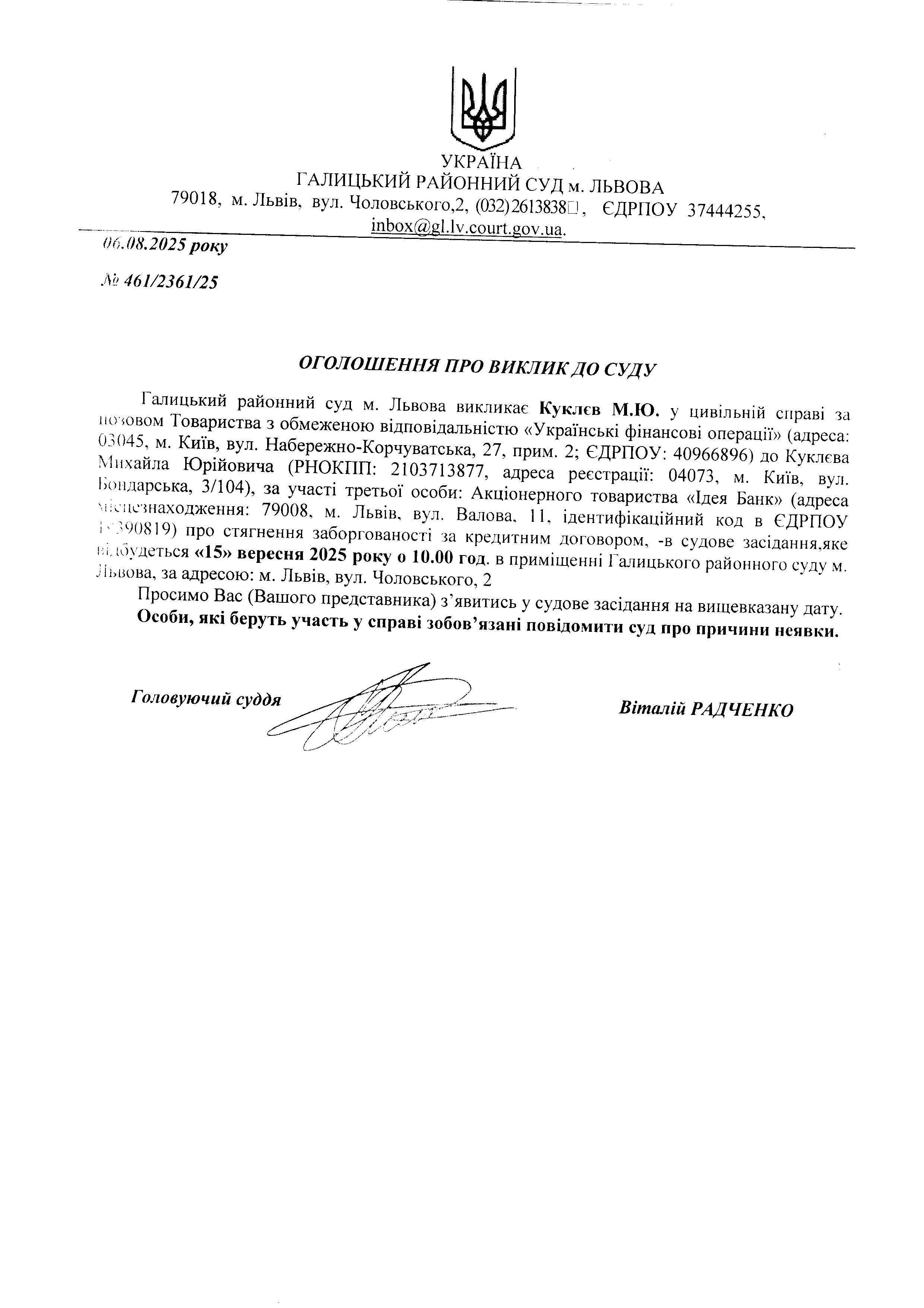 оголошення про виклик Куклєва М.Ю.