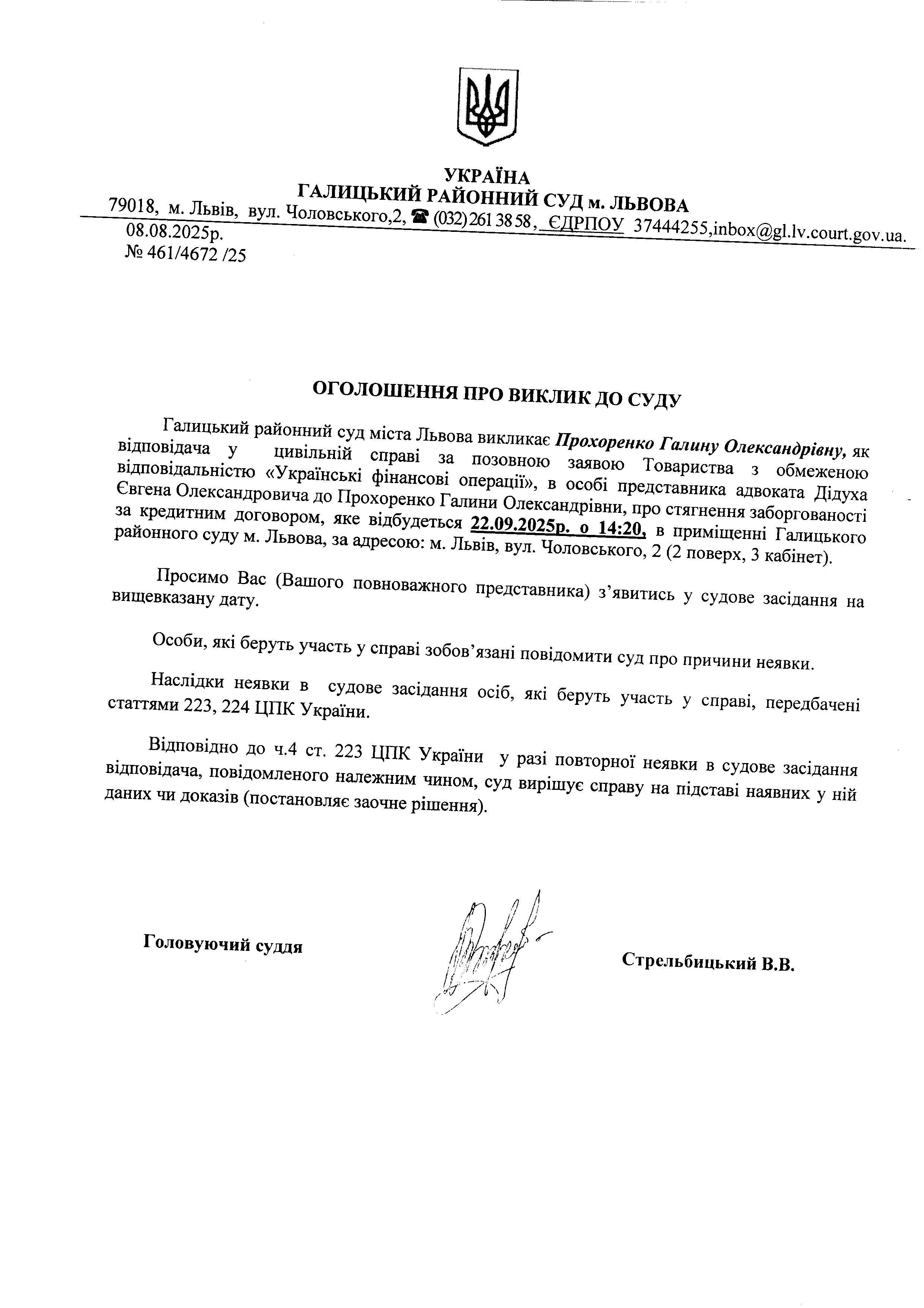 оголошення про виклик Прохоренко Г.О.