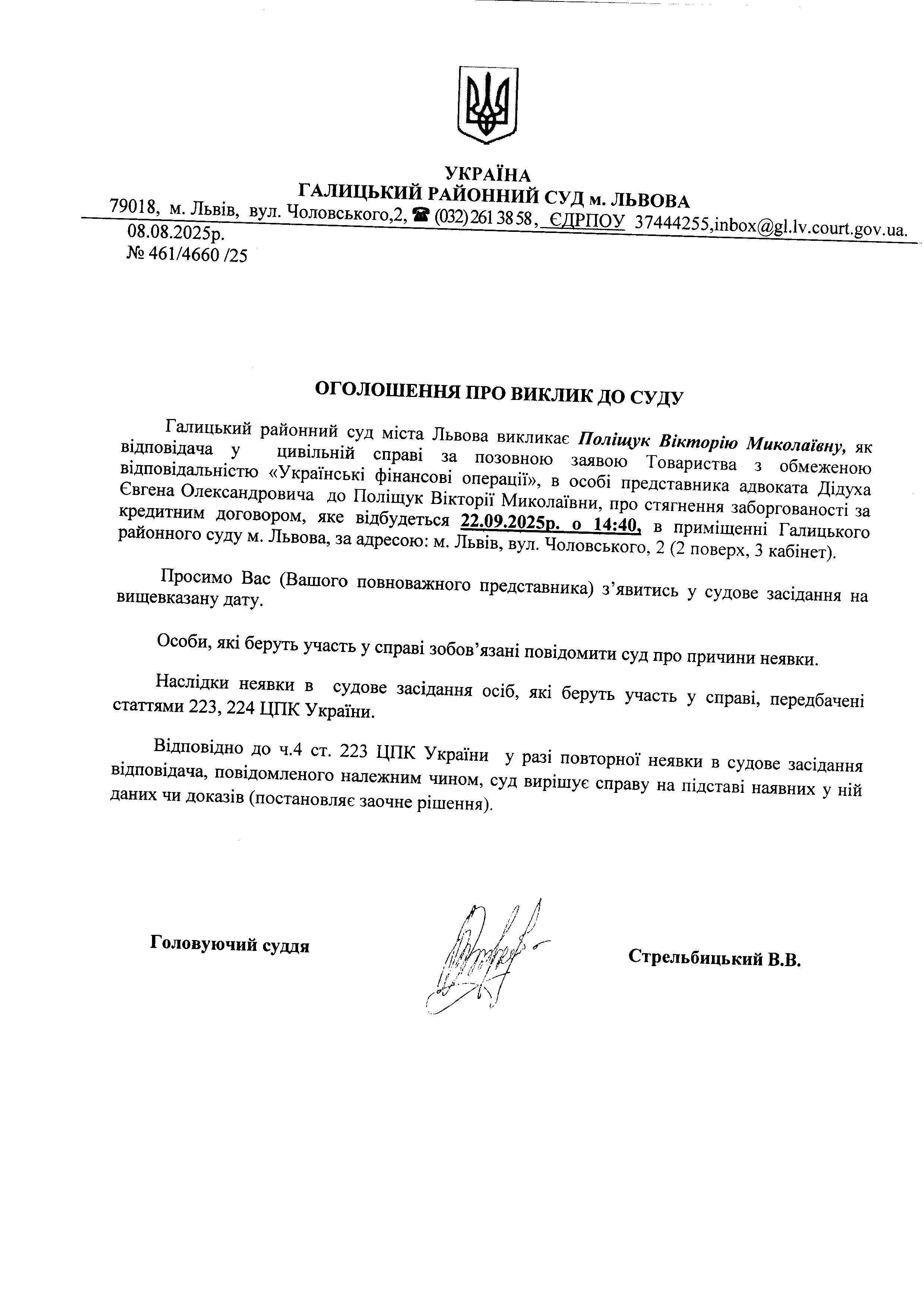 оголошення про виклик Поліщук В.М.