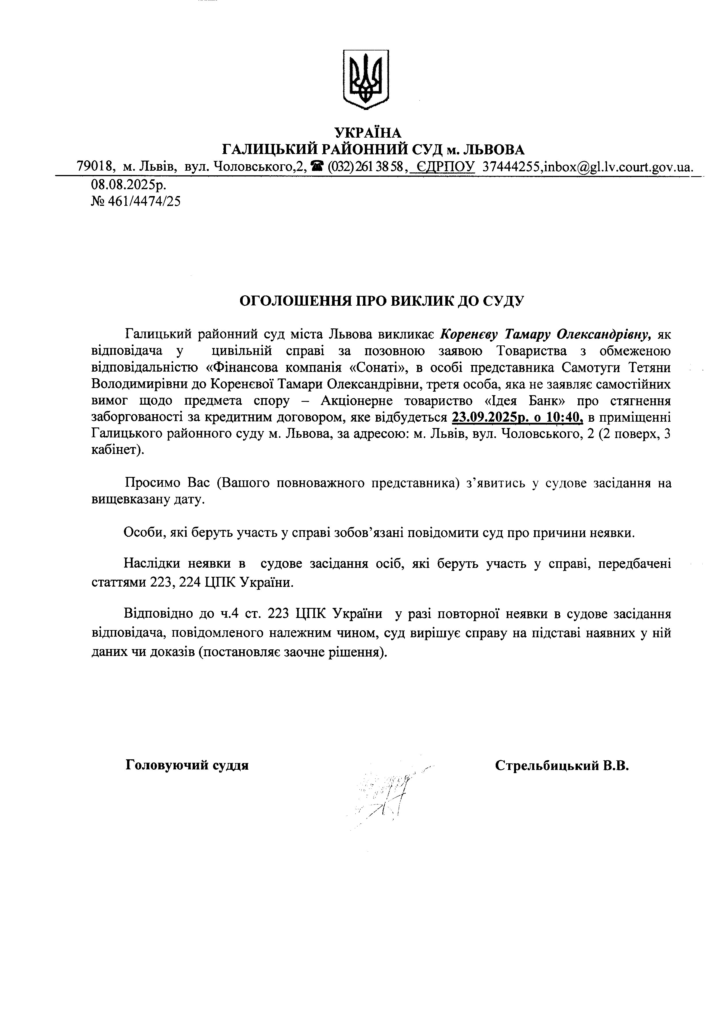 оголошення про виклик Коренєвої Т.О.