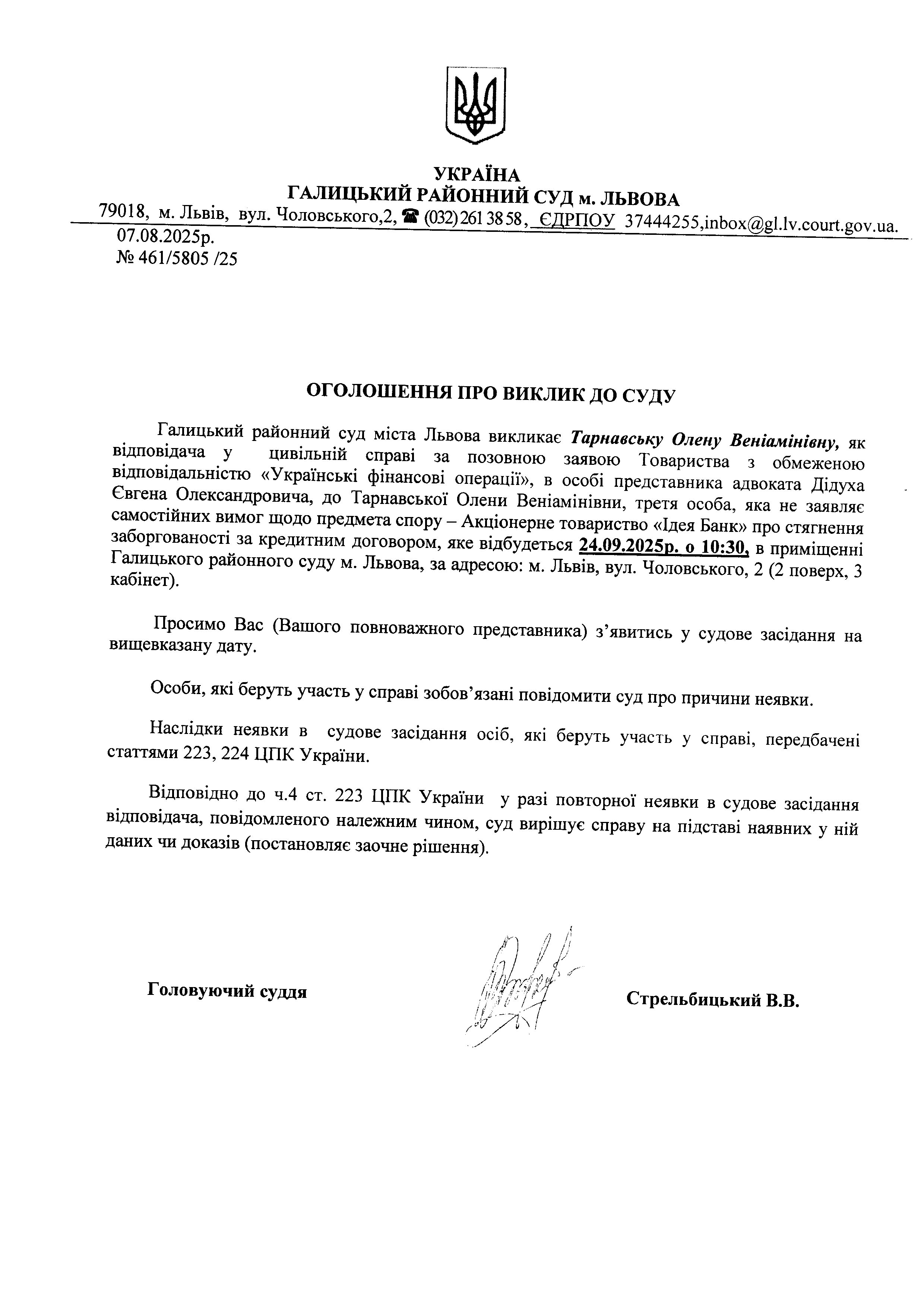 оголошення про виклик Тарнавської О.В.