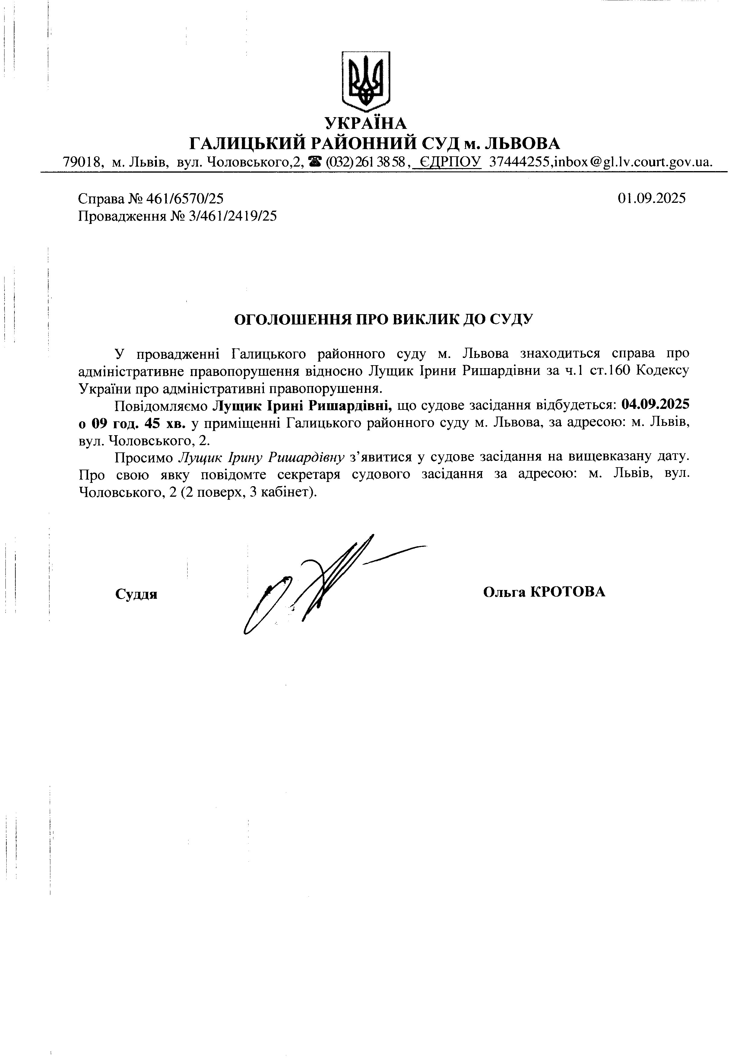 оголошення про виклик Лущик І.Р.