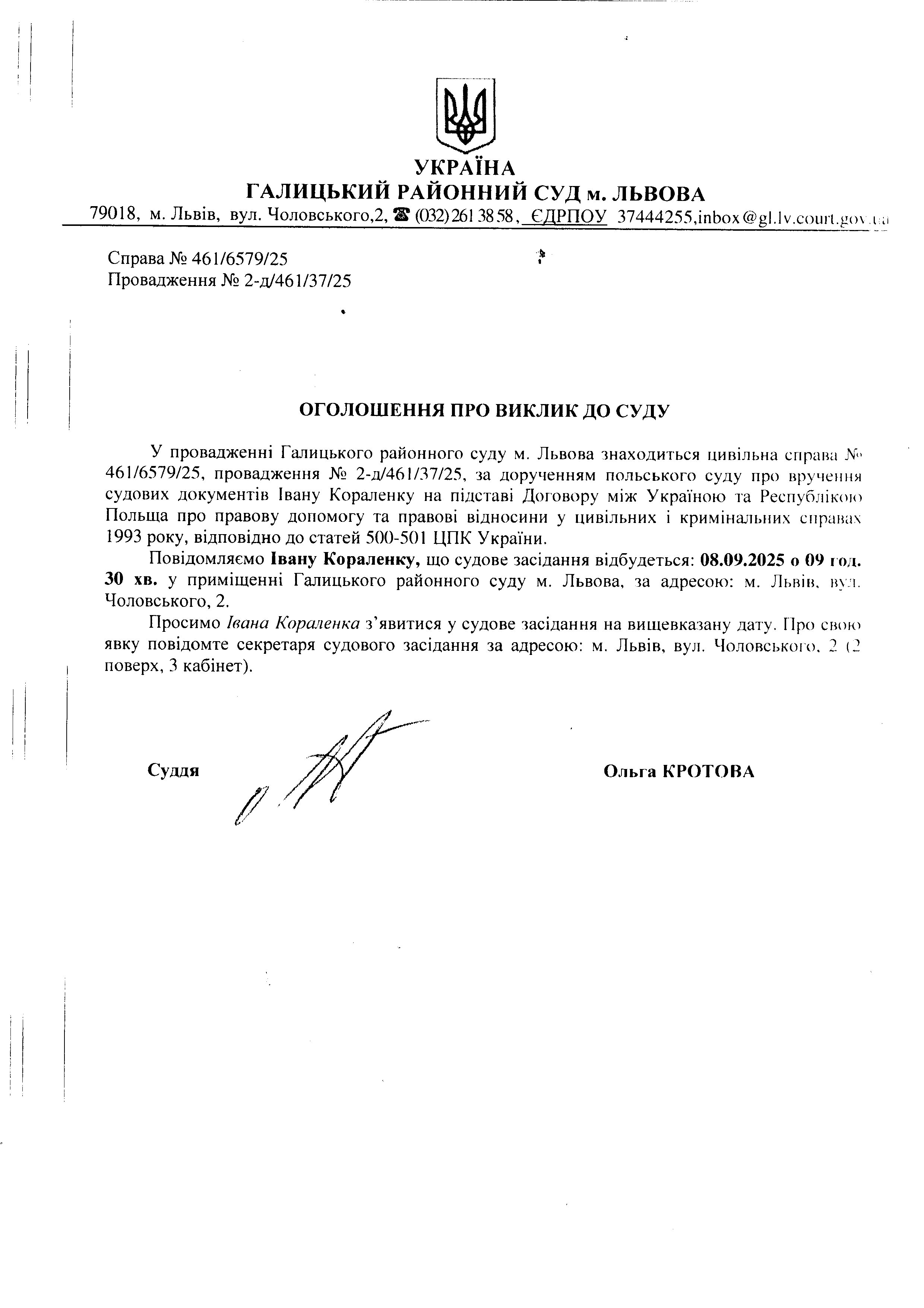 оголошення про виклик Кораленка І.