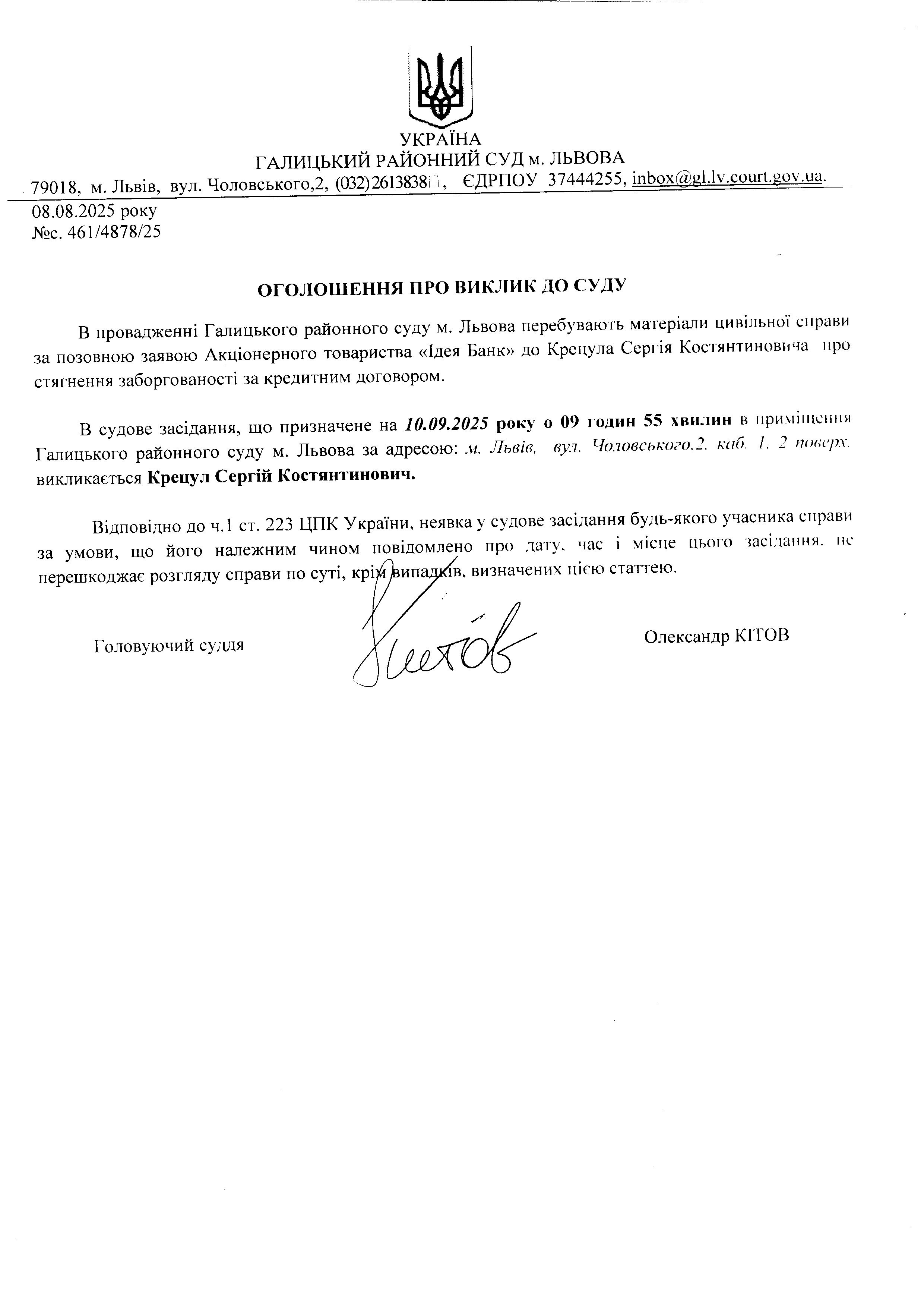 оголошення про виклик Крецул С.К.