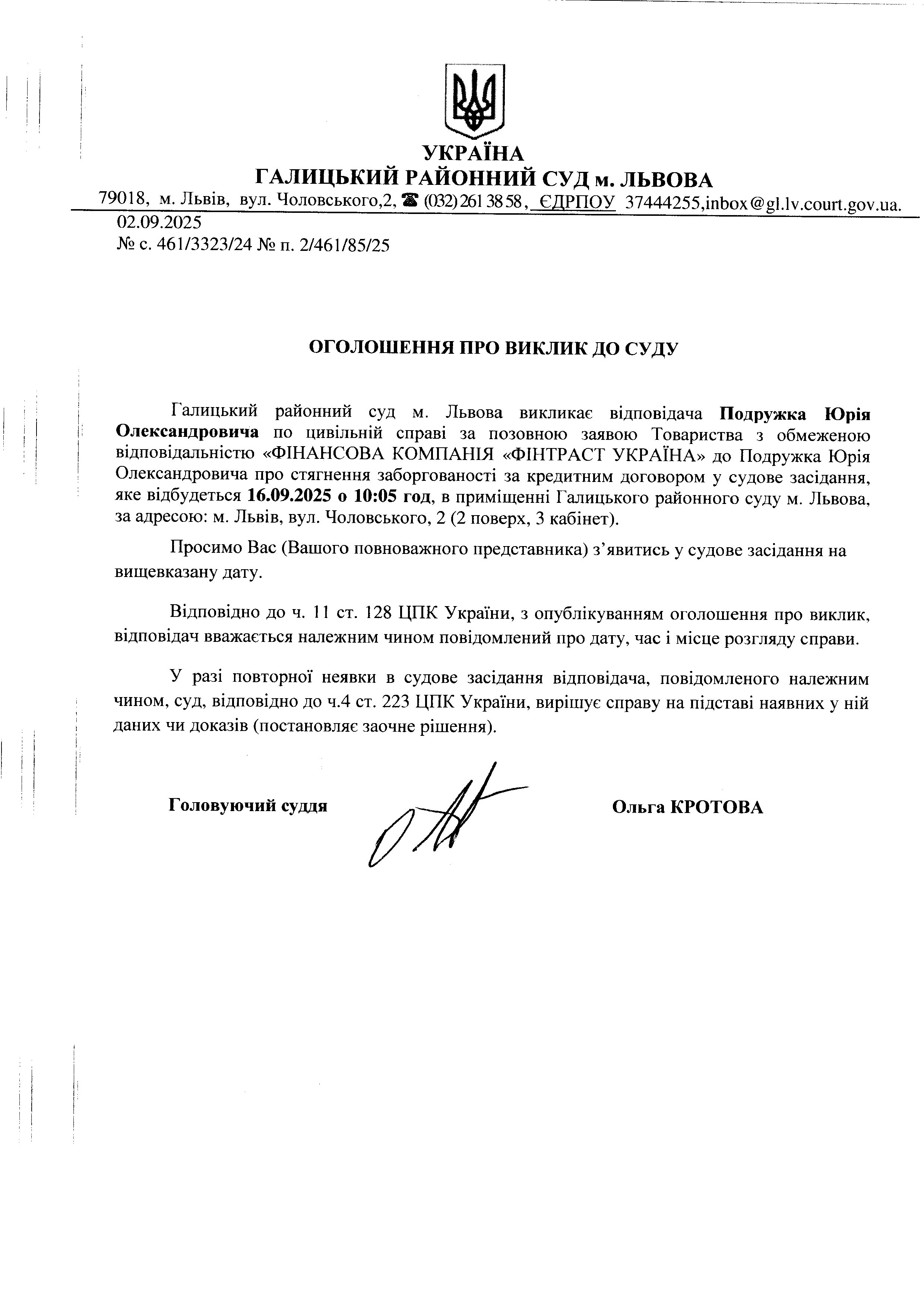 оголошення про виклик Подружка Ю. О.