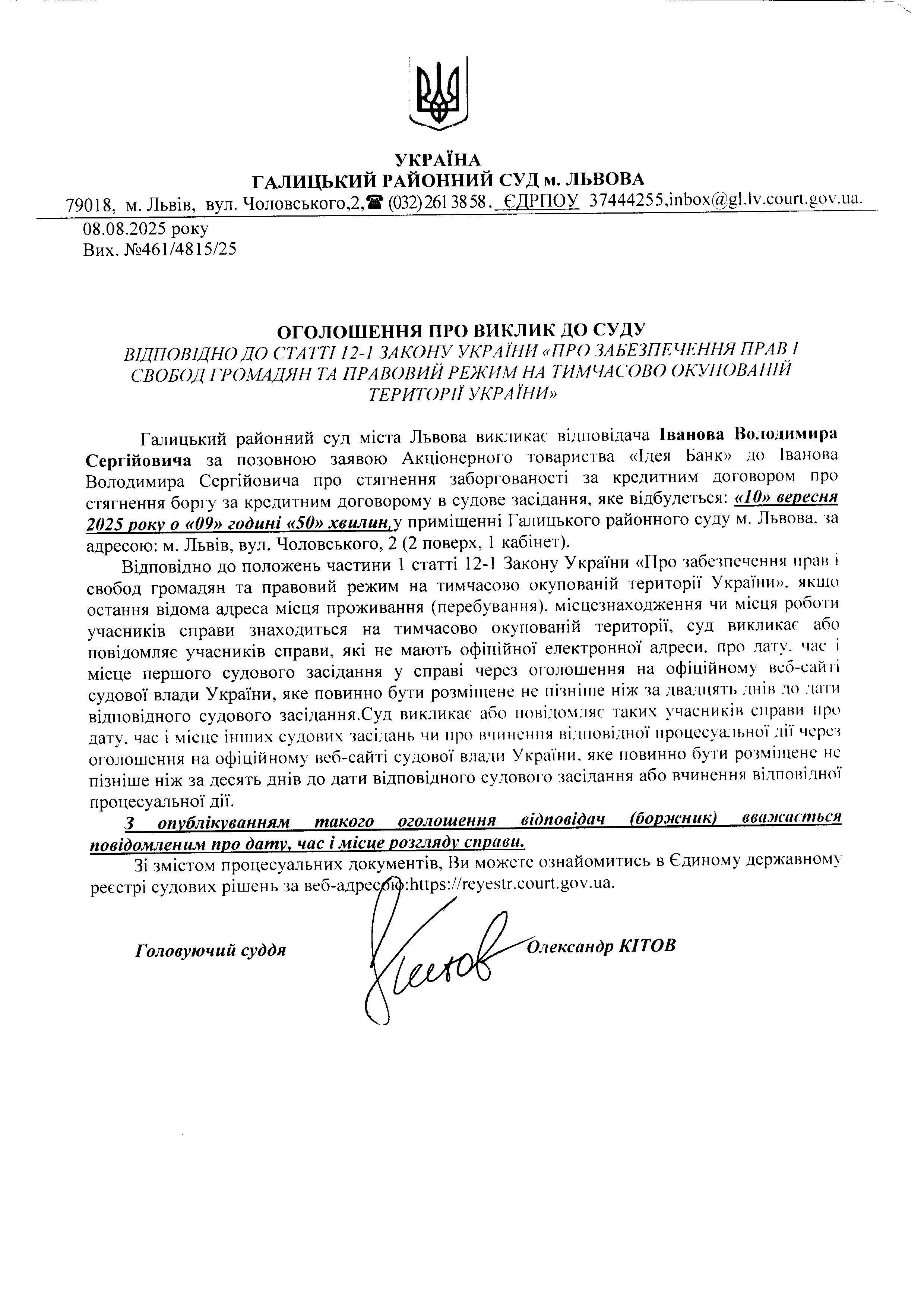 оголошення про виклик Іванова В.С.