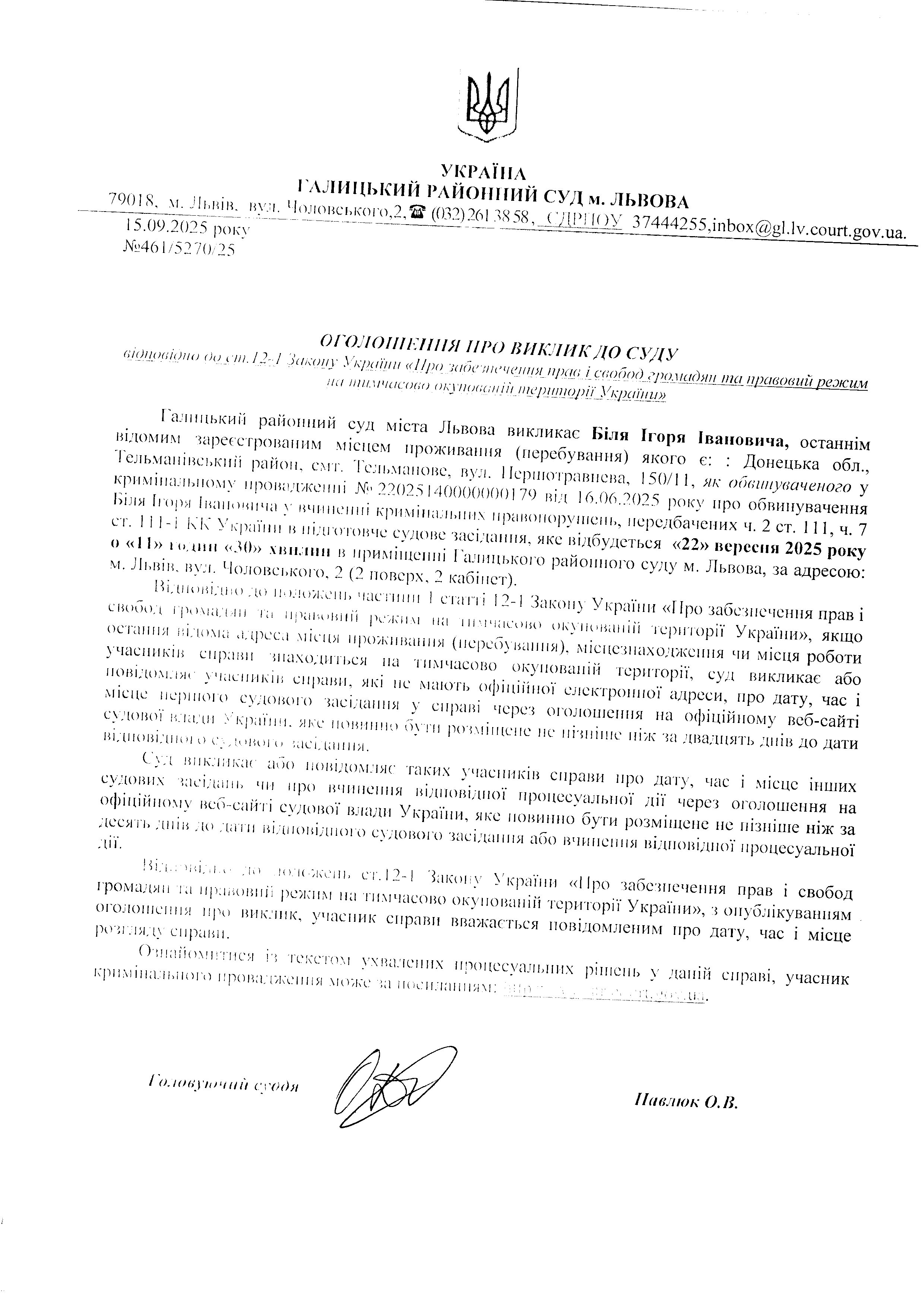 оголошення про виклик Біля І.І.
