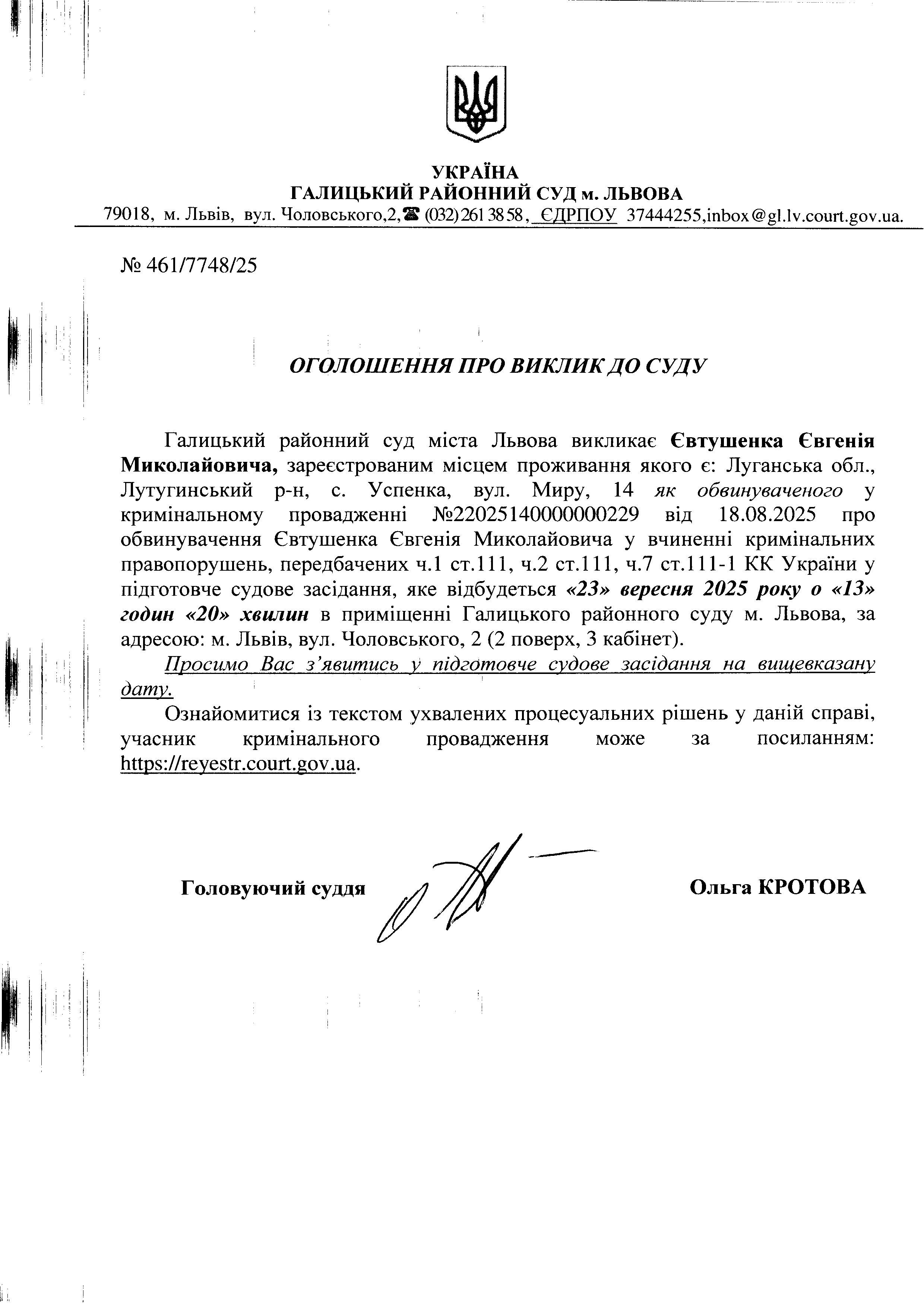 оголошення про виклик Євтушенка Є.М.