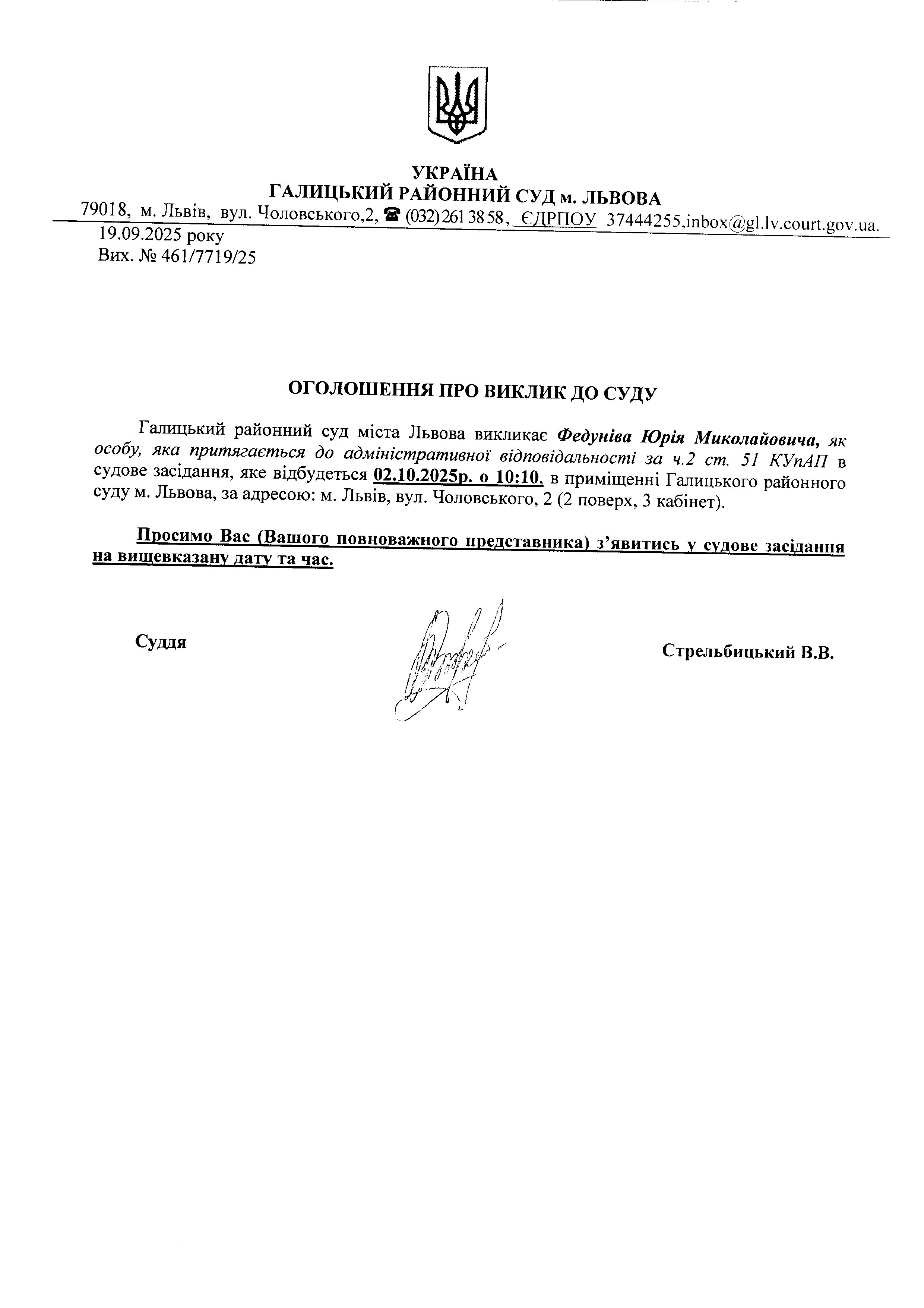 оголошення про виклик Федуніва Ю.М.