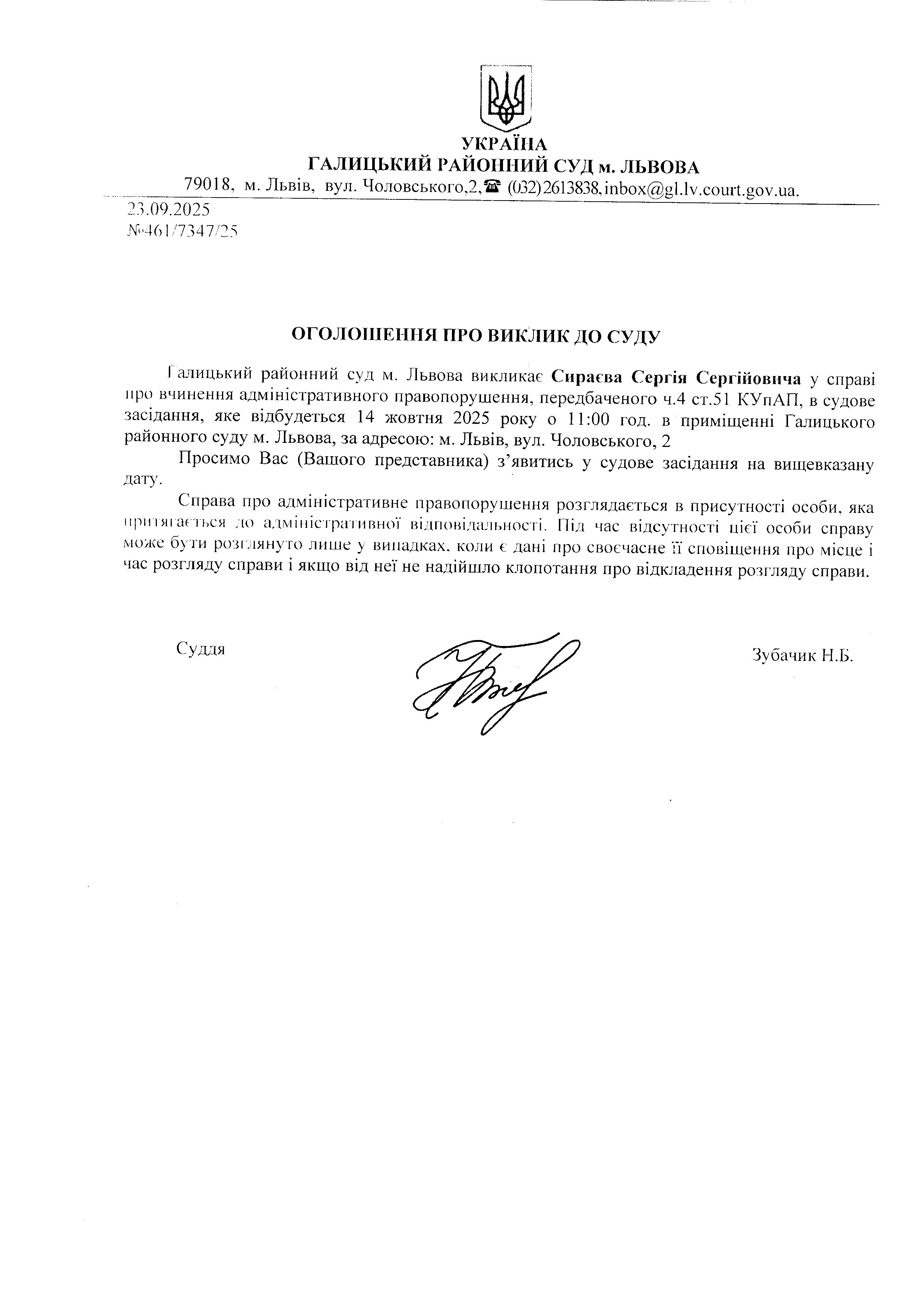 оголошення про виклик Сираєва С.С.