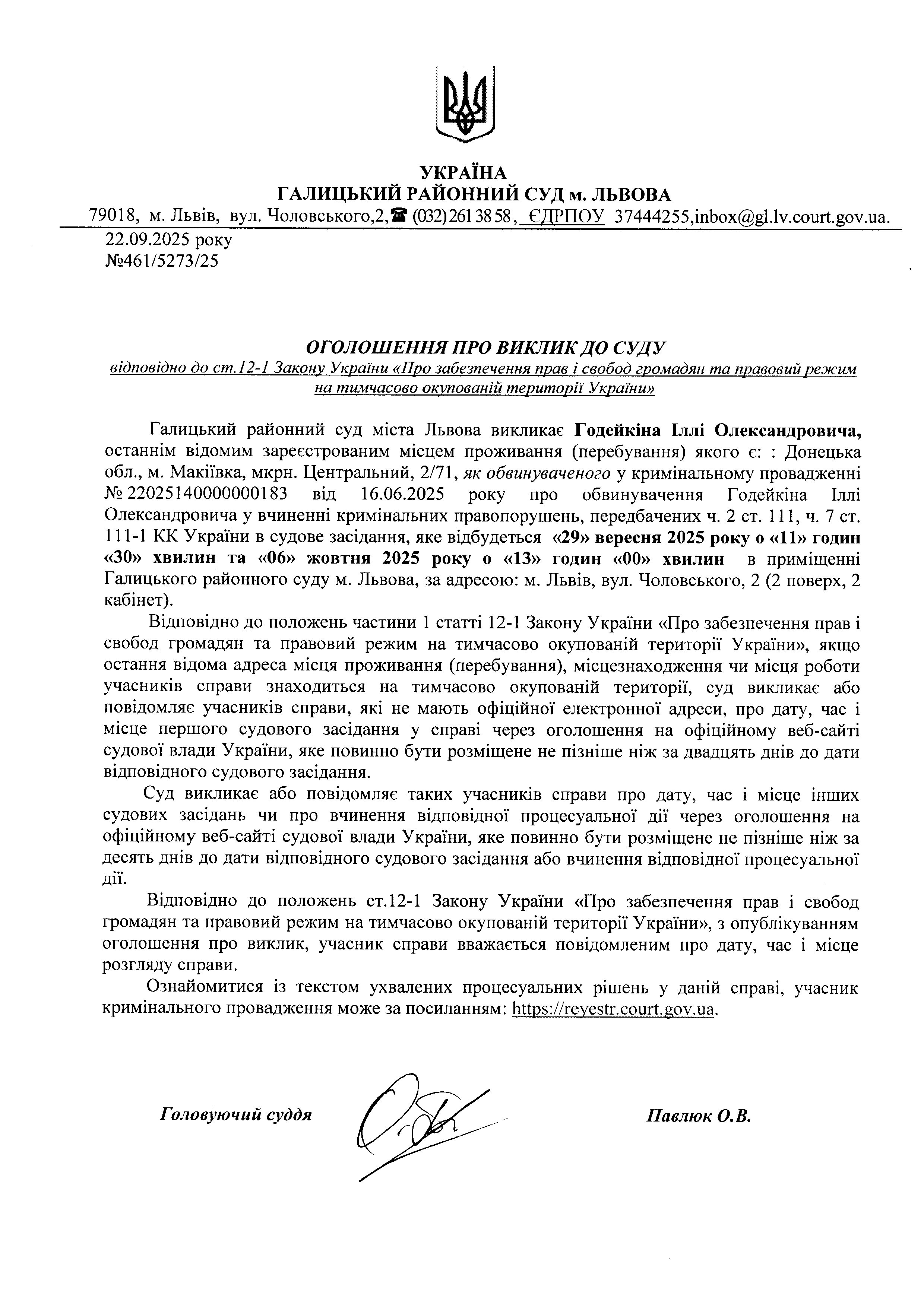 оголошення про виклик Годейкіна І.О.