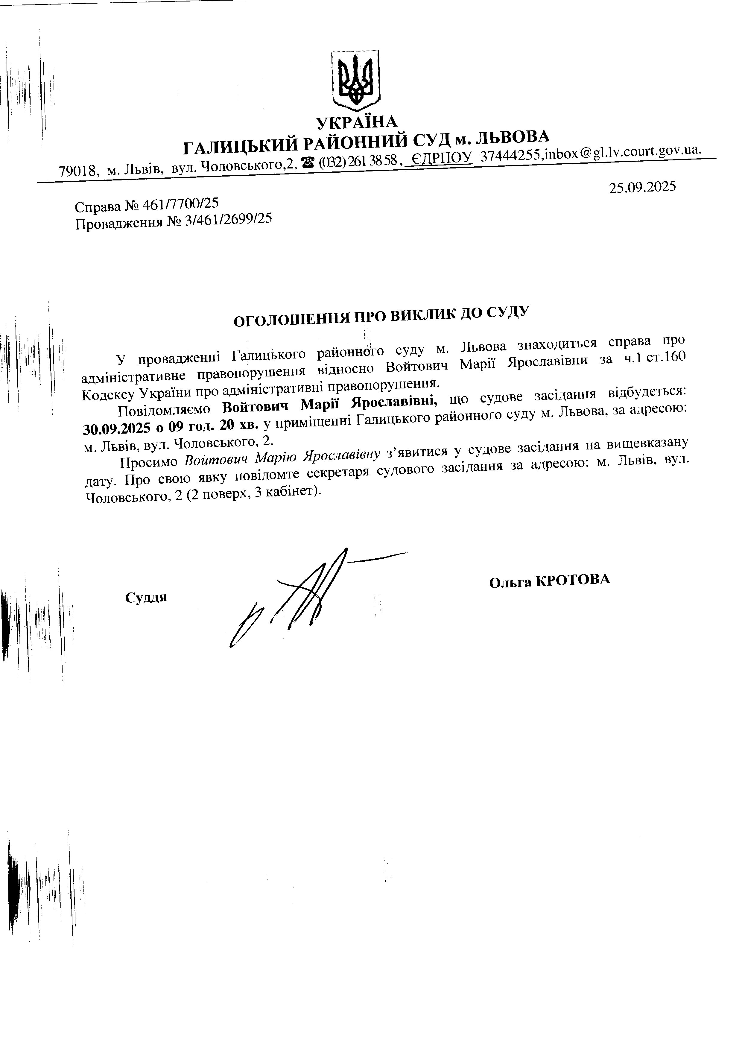 оголошення про виклик Войтович М.Я