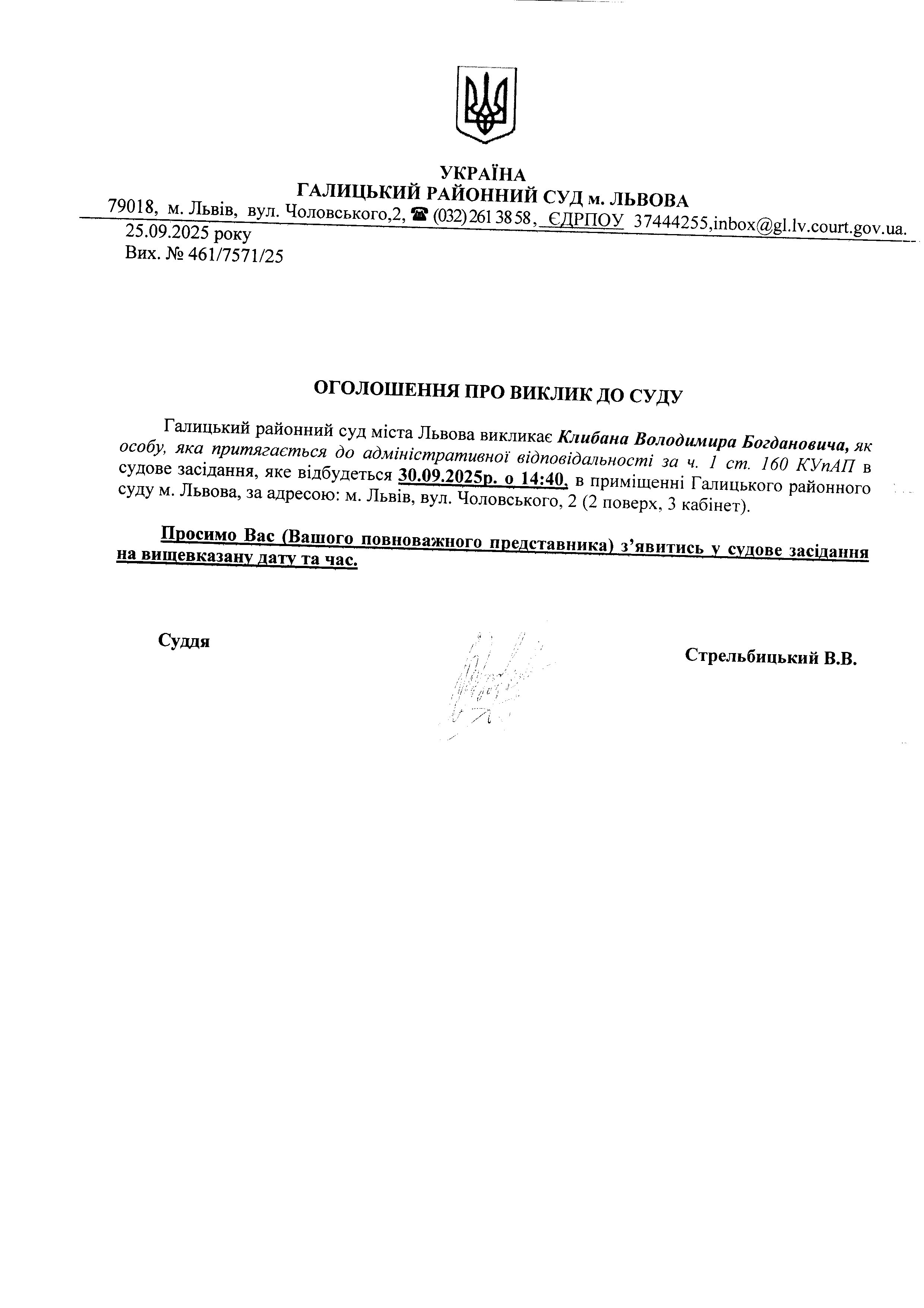 оголошення про виклик Клибана В.Б.