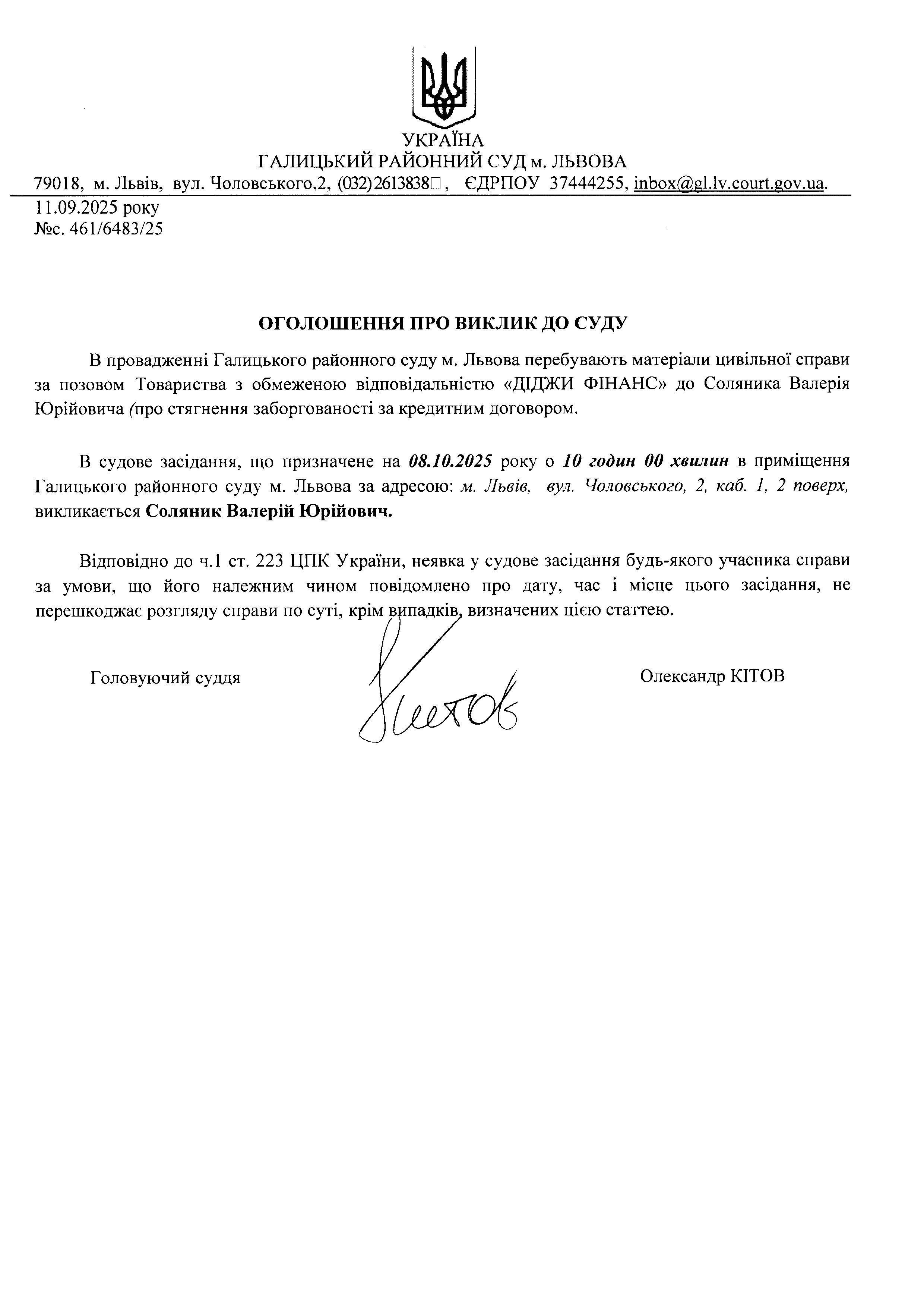 оголошення про виклик Соляника В.Ю.